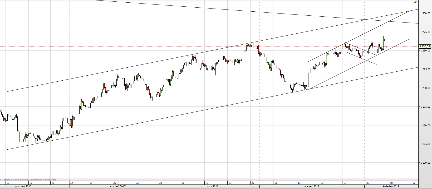 Złoto porusza się w silnym krótkoterminowym trendzie wzrostowym, uformowanym od połowy marca. W dalszej perspektywie notowania znajdują się w połowie długoterminowego kanału wzrostowego (jego początek to grudzień 2016 r.). Naruszenie poziomu 1263 USD/oz otwiera drogę metalowi do okolic 1280 USD/oz (opór wynikający z linii trendu spadkowego od lipca 2016 r.). Jego pokonanie nakreśli prawdopodobny wówczas atak na okrągłą strefę 1300 USD/oz, która jednocześnie jest górnym ograniczeniem kanału wzrostowego.