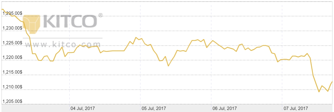 Piątek przyniósł spadek notowań do najniższego poziomu od blisko czerech miesięcy, po tym jak dane dot. nowych miejsc pracy w sektorze pozarolniczym w USA okazały się lepsze od prognozowanych (222 tys. vs. 179 tys.). Dolar zyskał na perspektywie rychłej podwyżki stóp procentowych, a cena uncji złota na spocie spadła do 1207,15 USD. Tydzień zakończył się z wynikiem 1215,65 USD na zamknięciu giełdy w Londynie i 1213,20 USD a Oceanem, co oznaczało dla złota spadek rzędu 2,5 proc.
