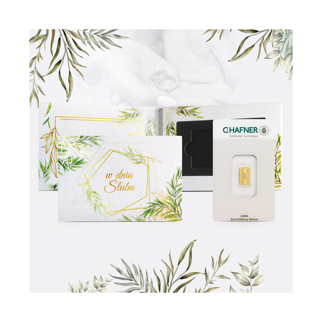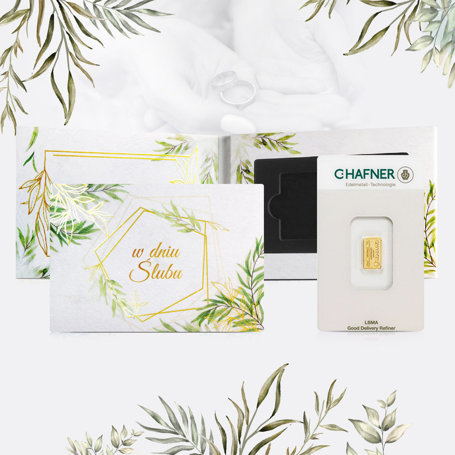 Złoto to zatem idealny wybór na prezent dla młodej pary w dniu ich ślubu, a tak wyjątkowy prezent wymaga odpowiedniej oprawy. Prezentujemy okolicznościowe opakowanie prezentowe na sztabkę w certipack’u*. To opcja praktyczna (możemy bezpiecznie schować wybraną sztabkę) i elegancka. Po latach można z sentymentem wracać do takiej pamiątki, tym bardziej, że opakowanie posiada specjalne miejsce na wpisanie własnych życzeń.