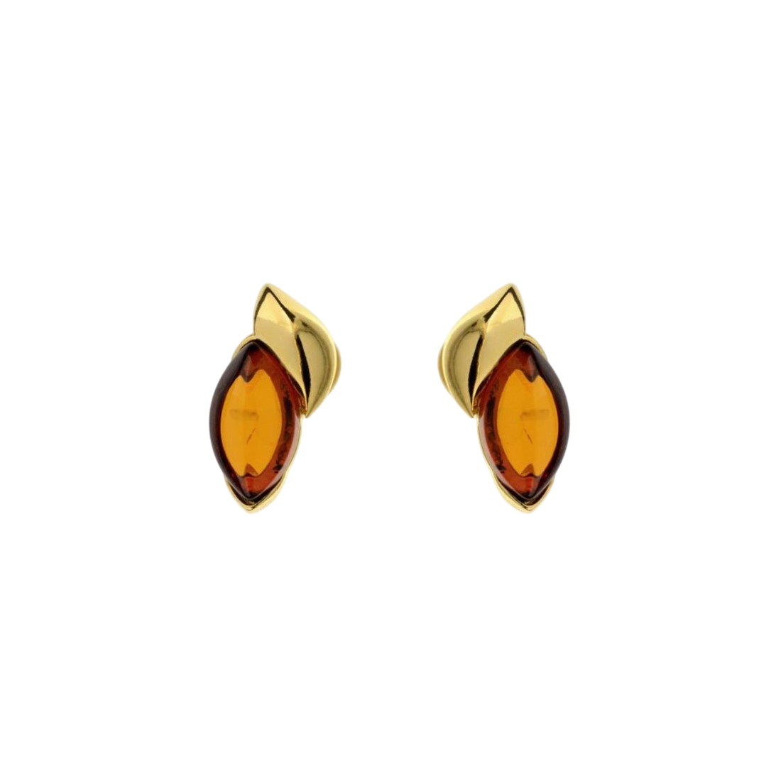 Kolczyki ze sztyftem wykonane w całości z pozłacanego srebra próby 925 z naturalnym certyfikowanym bursztynem bałtyckim w kolorze koniakowym.