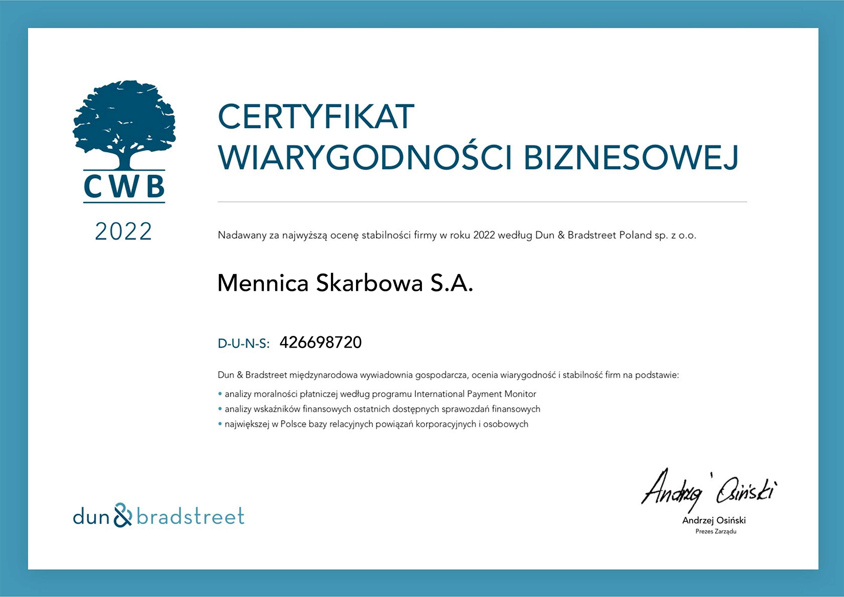 Wraz z certyfikatem, Mennicy Skarbowej nadany został międzynarodowy numer D-U-N-S: 426698720, to jedyny uznawany na całym świecie wskaźnik, który stanowi potwierdzenie rejestracji i prowadzenia działalności przez podmiot gospodarczy.