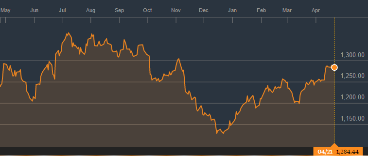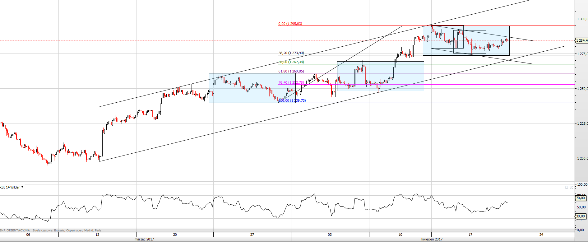 Z technicznego punktu widzenia złoto wykonało w ostatnich 5 sesjach techniczną korektę. Jej zasięg był zbliżony swoją rozpiętością do dwóch poprzednich (z końca marca oraz z pierwszej połowy kwietnia). Jest to dowód na to, że obecnie rynek złota porusza się wybitnie „technicznie”. Cena dodatkowo zatrzymała się na ważnym wsparciu wynikającym z poziomu  Fibonacciego (38.2%). Piątkowe wzrosty metalu zatrzymały się na górnym ograniczeniu formacji flagi. Przełamanie tej linii da sygnał kupna i otworzy tym samym drogę do poziomu 1300 dol. za uncję. W przypadku pozytywnego dla rynku finansowego wyniku pierwszej tury wyborów we Francji, z dużym prawdopodobieństwem metal ponownie przetestuje średnioterminową linię trendu wzrostowego (okolice 1270 dol. za uncję).