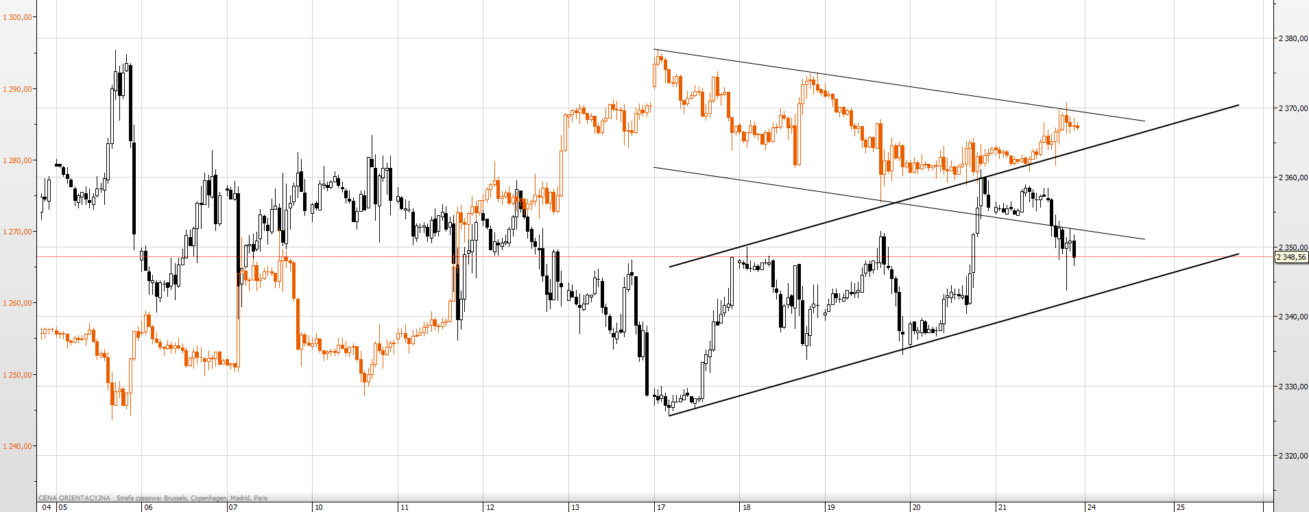Wykres 2: Złoto oraz kontrakt CFD na SP500, interwał 1-godzinowy