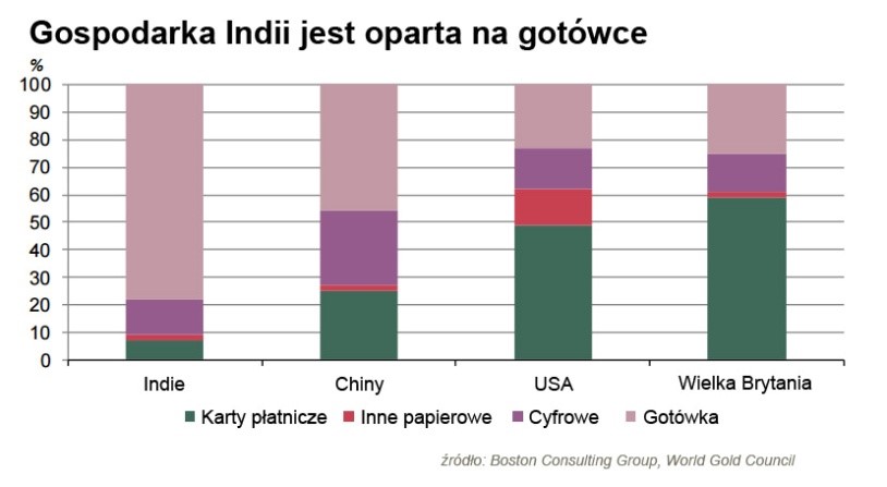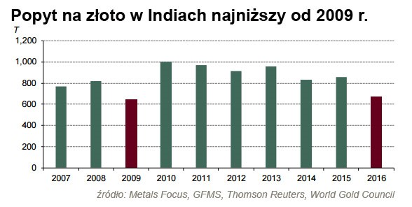 W ubiegłym roku popyt na złoto w Indiach spadł do najniższego poziomu od 2009 roku. Nowe reformy sprawiły, że część obywateli nagle zaczęła się powstrzymywać od zakupów złota, a słabe nastroje na terenach wiejskich i rosnąca cena kruszcu skutecznie zniechęcały pozostałych. Globalny popyt na żółty kruszec wyraźnie na tym ucierpiał.