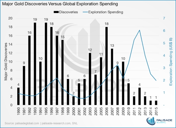 Warto przy tym podkreślić, że nawet w przypadku znacznego wzrostu notowań, prowadzącego do wzrostu rentowności kopalń, problem stanowi brak nowych odkryć (wykres powyżej). Największe wydatki na poszukiwanie złota przypadły na 2012 rok, kiedy spółki górnicze wydały na eksplorację aż 6 miliardów dolarów. Jeszcze dekadę temu na świecie dokonywano 18 nowych odkryć znaczących złóż (tj. takich o szacowanej zawartości miliona uncji). Dziś takie odkrycia zdarzają się średnio raz na rok.