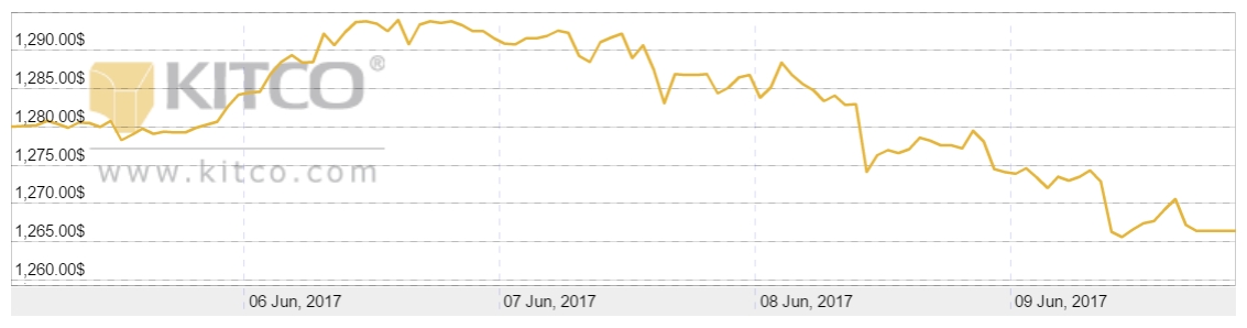 Miniony tydzień obfitował w wyczekiwane przez inwestorów wydarzenia, ale nie brakowało i tych zupełnie nowych, jak zerwanie stosunków dyplomatycznych z Katarem przez kilka państw z rejonu Bliskiego Wschodu. Oczy większości inwestorów skierowane były jednak przede wszystkim na zeznania byłego szefa FBI w sprawie domniemanego wpływu Rosjan na wybory prezydenckie w USA. Czekano także na wybory parlamentarne w Wielkiej Brytanii, które miały umocnić pozycję premier May w negocjacjach brexitowych. Jak się okazało, Comey niczym nie zaskoczył, a Theresa May zamiast zyskać, straciła poparcie. Wzmocniony dolar posłał cenę złota w dół i tydzień zakończył się z wynikiem 1266,40 USD/oz.