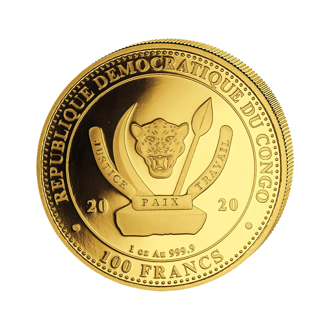 One side of the coin depicts a whale breaching out of the water. The background is the ocean, and we also see clouds on the horizon. At the edge of the gold coin are the inscriptions "The Whale" and "World’s Wildlife". On the other side is the coat of arms of the Democratic Republic of the Congo.