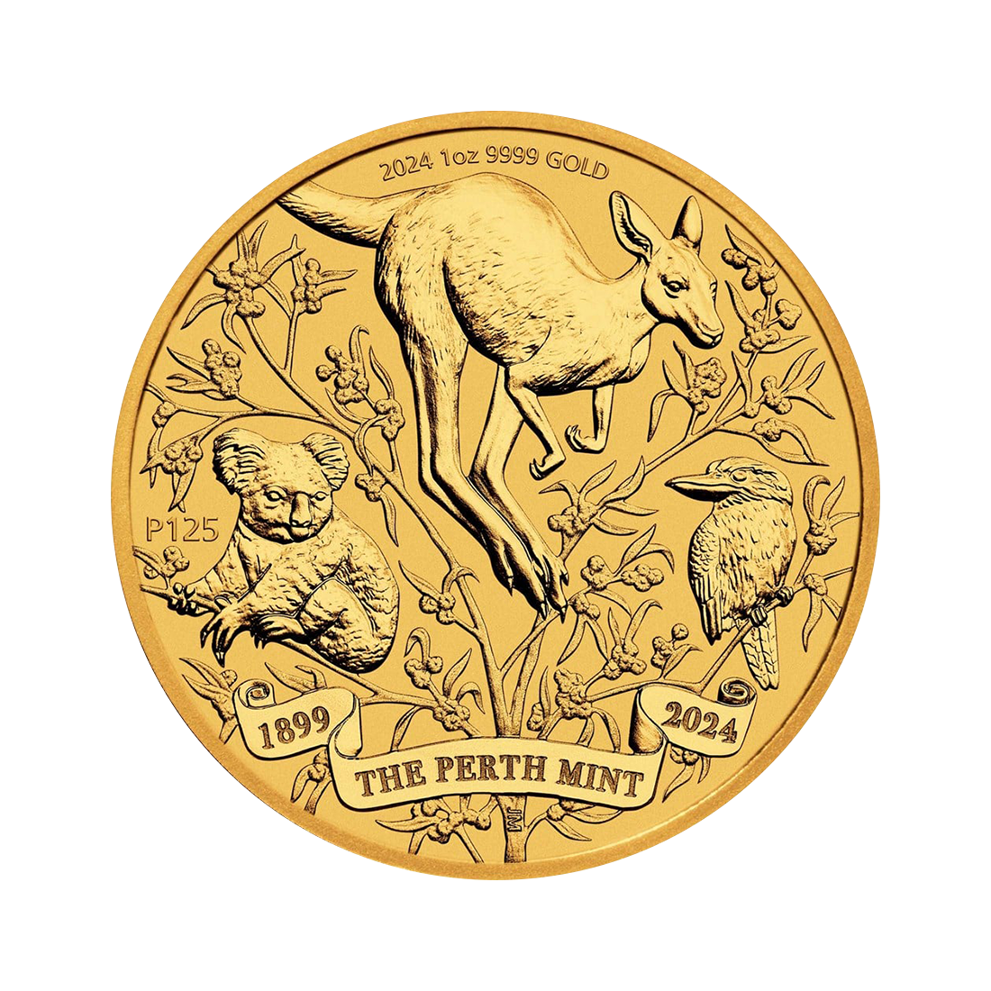 Referencing its most famous contemporary coin series, this coin features a kangaroo, kookaburra, and koala, artistically placed among golden wattles - Australia's national flower. At the bottom of the design is the inscription: 1899 THE PERTH MINT 2024. Additionally, the mint mark P125, as well as the weight, purity, and year of minting, are also included.