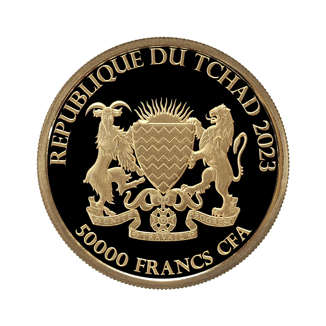 The 2023 coin features the motif of a bull fighting a bear, symbolizing the changing market moods – the bull as growth and the bear as decline. The reverse side shows the silhouettes of both animals in a dynamic fighting pose, as well as the weight and gold purity. All elements are placed on a uniform black background, further emphasizing the coin's majesty. The obverse contains the coat of arms of the Republic of Chad, the year of minting, and the denomination. The details on the coin symbolize the contrast between the bull and bear markets.