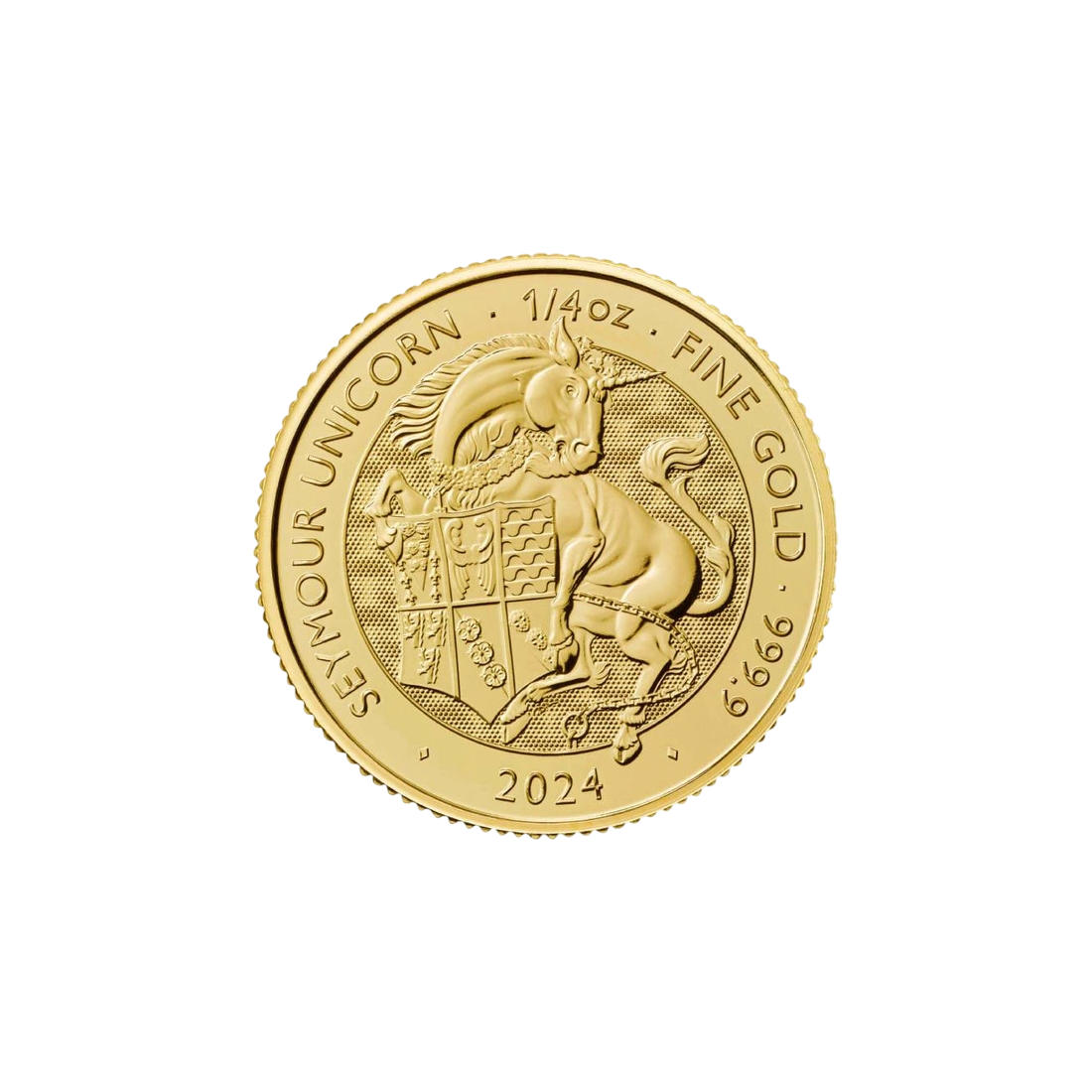 The coin is struck from 1/4 troy ounce of pure gold with a fineness of 999, ensuring its high investment value. The coin's diameter is 22 mm, and its face value is 25 British pounds. The reverse features the image of a heraldic unicorn holding a shield, surrounded by the inscription "SEYMOUR UNICORN," the year of issue, and information about the weight and fineness of the bullion. The obverse is adorned with the profile of King Charles III, designed by Martin Jennings.