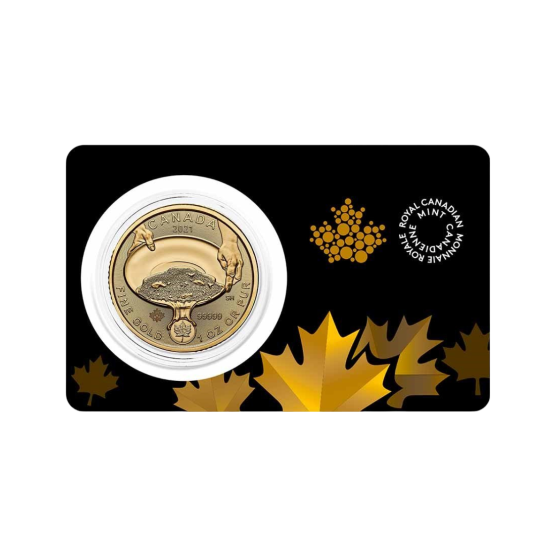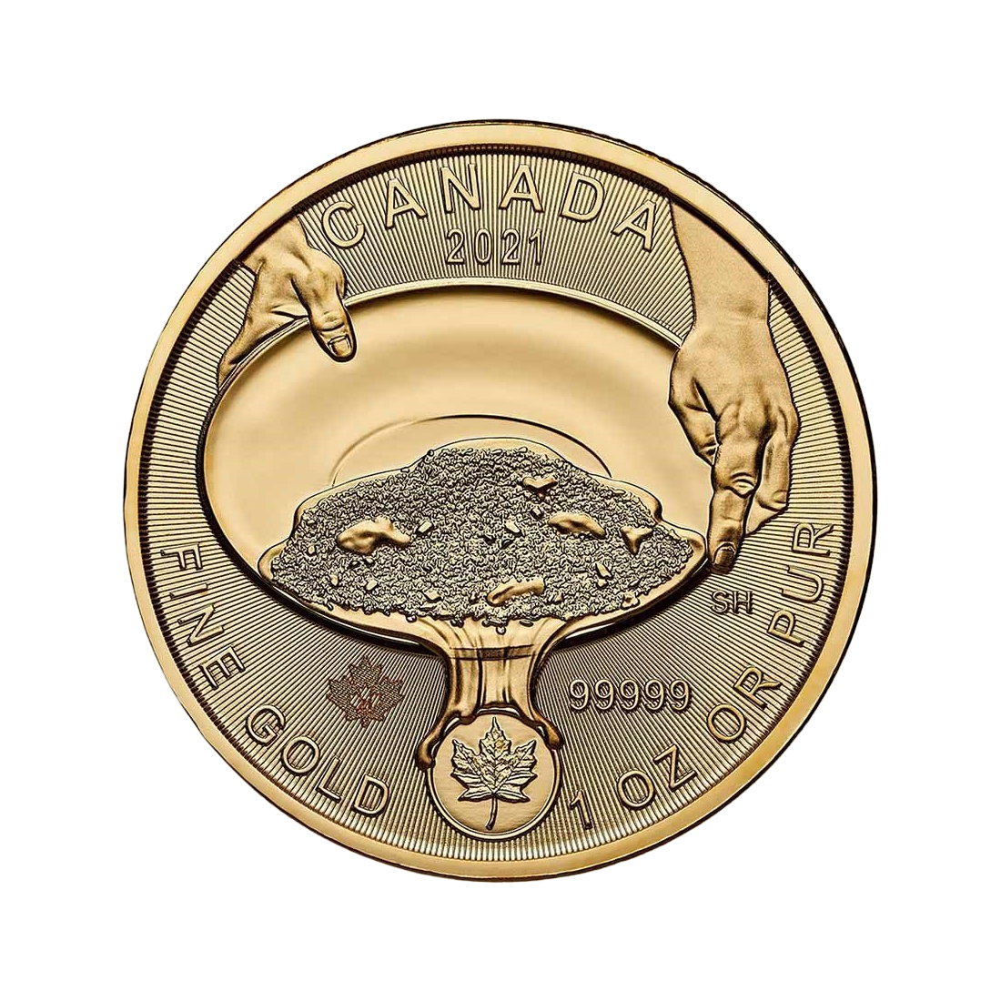 The reverse of the gold coin depicts hands holding a pan used for gold panning. The designer of the project beautifully and subtly showcased the gold processing process, where small particles ultimately form a coin with a maple leaf. It also includes information such as weight and fineness of the metal, the issuing country, and the year of issue.