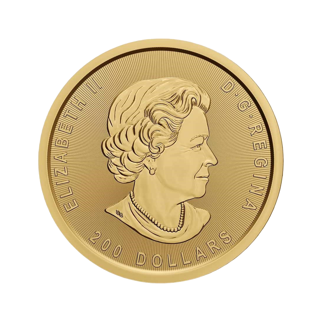 The obverse of the gold coin features a portrait of Queen Elizabeth II. The inscription "Elizabeth II D.G. REGINA" is engraved on the rim, along with the nominal value of the product.