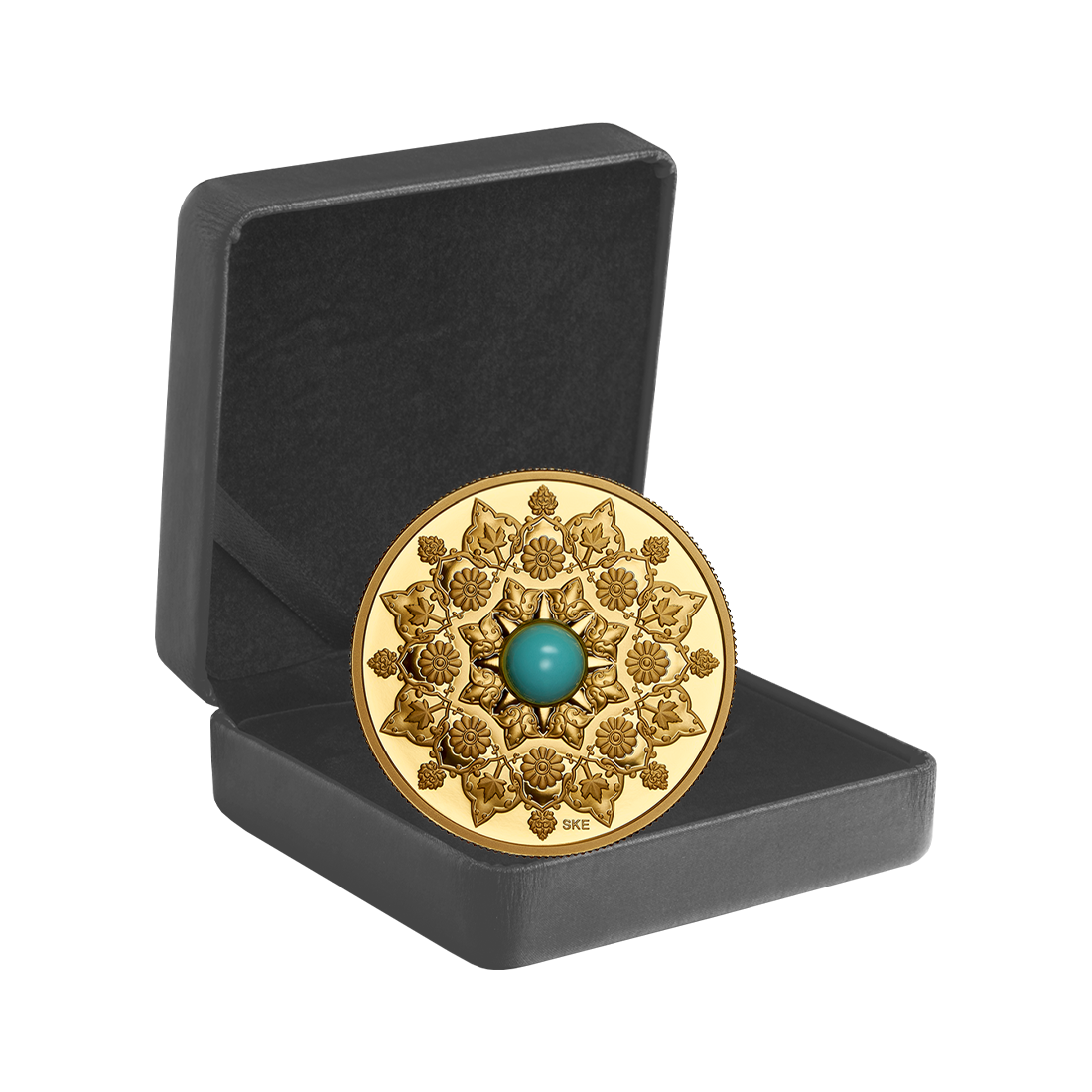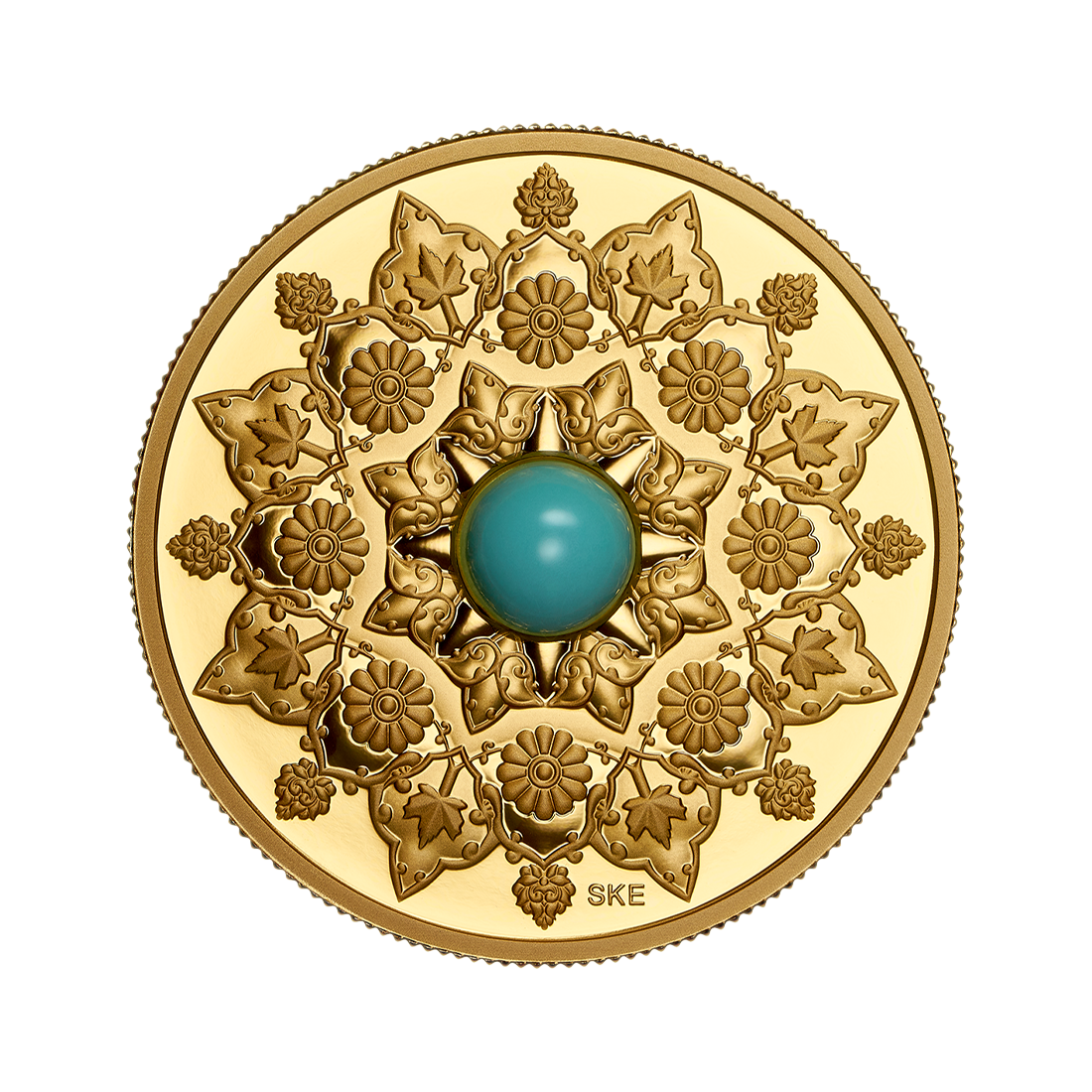 This gold coin, with a purity of 999.9 and a weight of one ounce, belongs to the fifth series in the Mint's Celebrating Canada's Diversity cycle and was minted by the Royal Canadian Mint. Adorned with a turquoise gemstone, its style draws on Iranian cultural traditions. These include shapes imitating carpet patterns, lotus flowers inspired by bas-reliefs in Persepolis, and the distinctive paisley pattern representing teardrops. Stylized maple leaves symbolize Canadian identity. This coin highlights the cultural and historical diversity of Canadian society.