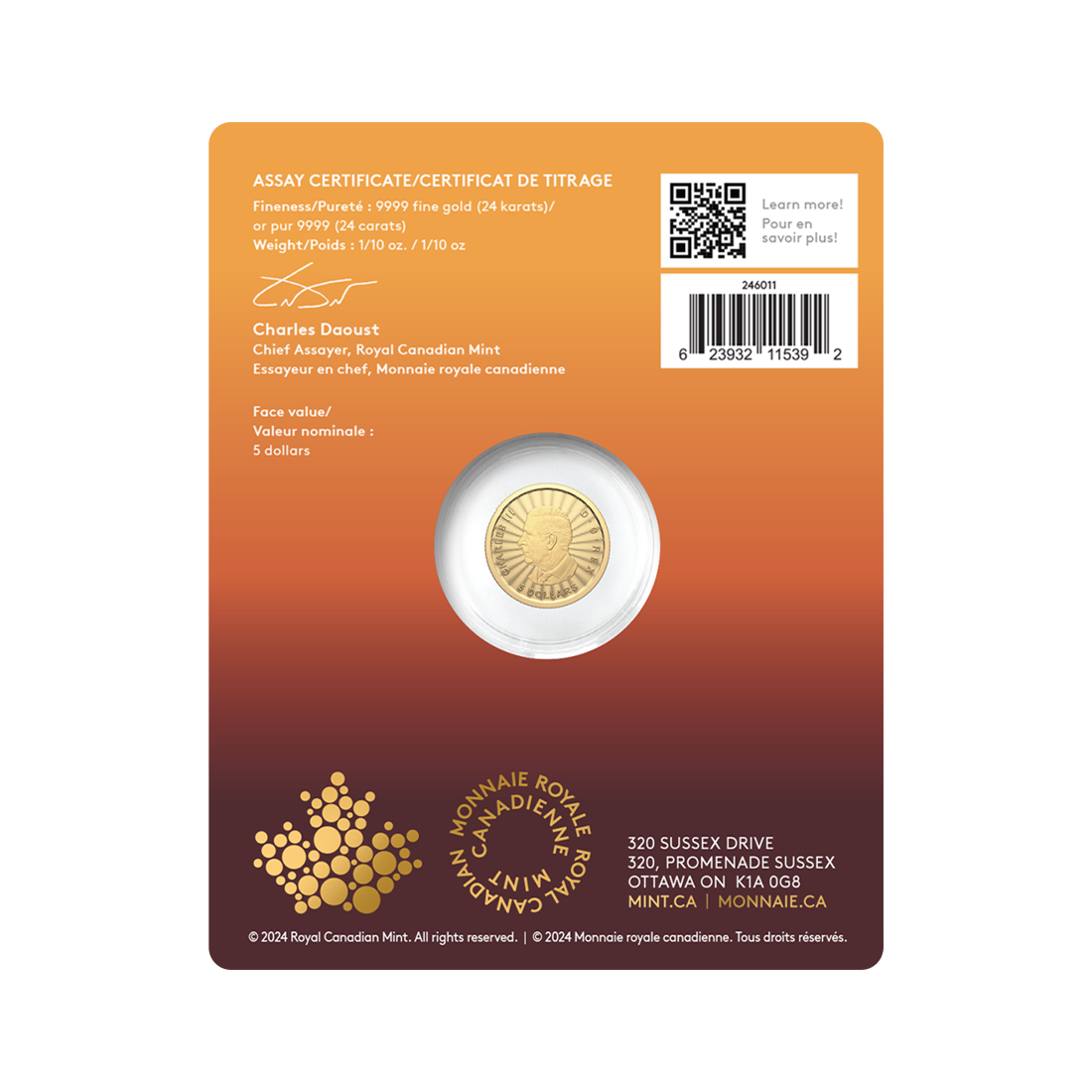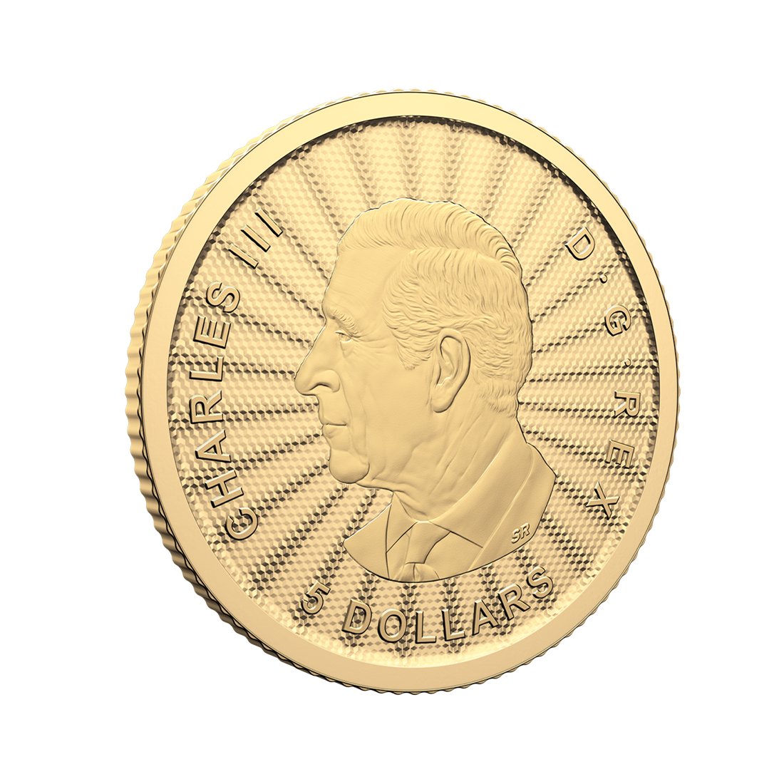 The obverse features the effigy of His Majesty King Charles III, surrounded by sun rays, designed by Canadian artist Steven Rosati.
