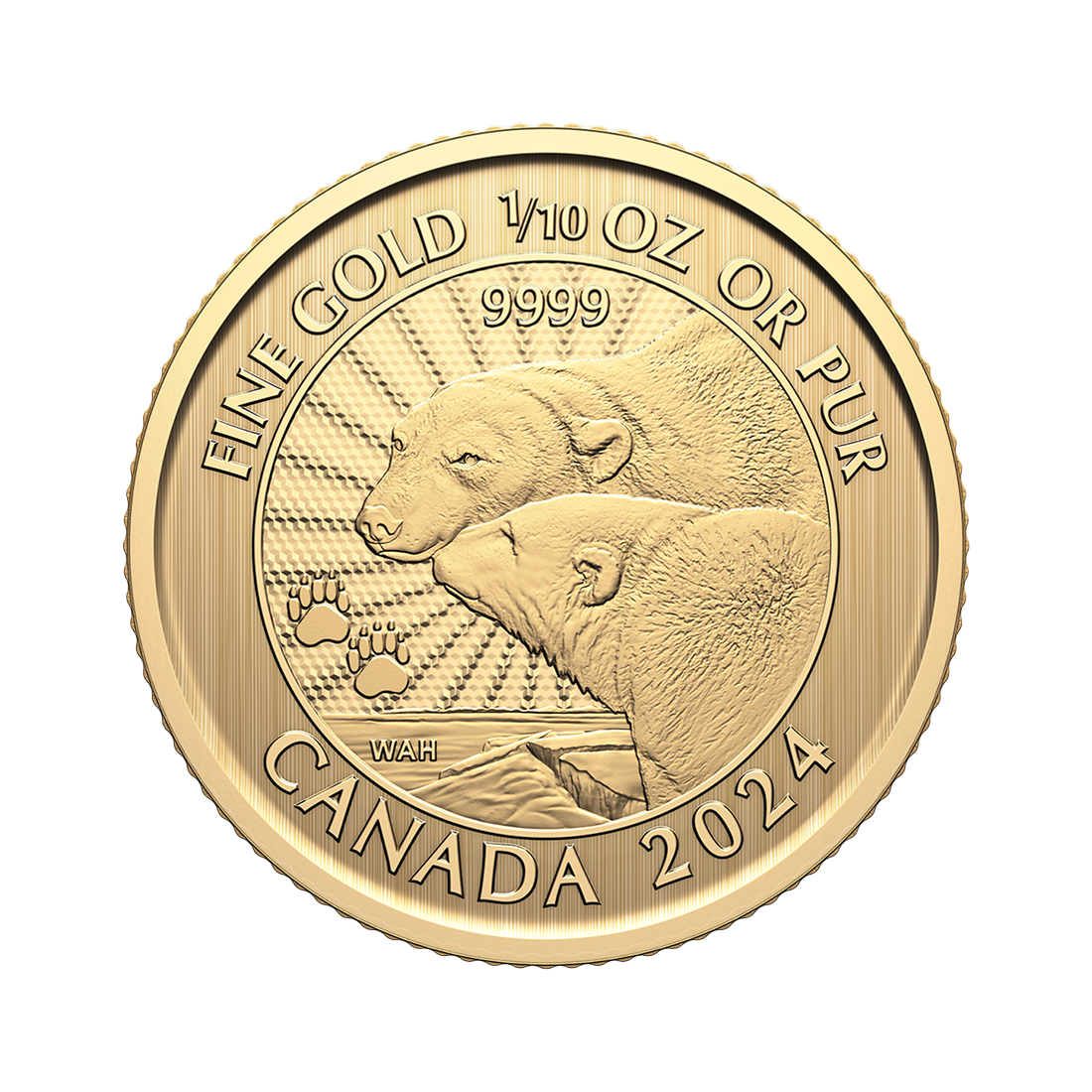 The reverse design by Canadian artist W. Allan Hancock shows a polar bear (Ursus maritimus) and her almost independent cub, snuggling in their Arctic habitat. This scene, enriched with paw prints that reference the theme, is set against stylized sun rays. The purity and weight of the coin, as well as the inscription CANADA and the year 2024, are engraved along the outer edge.