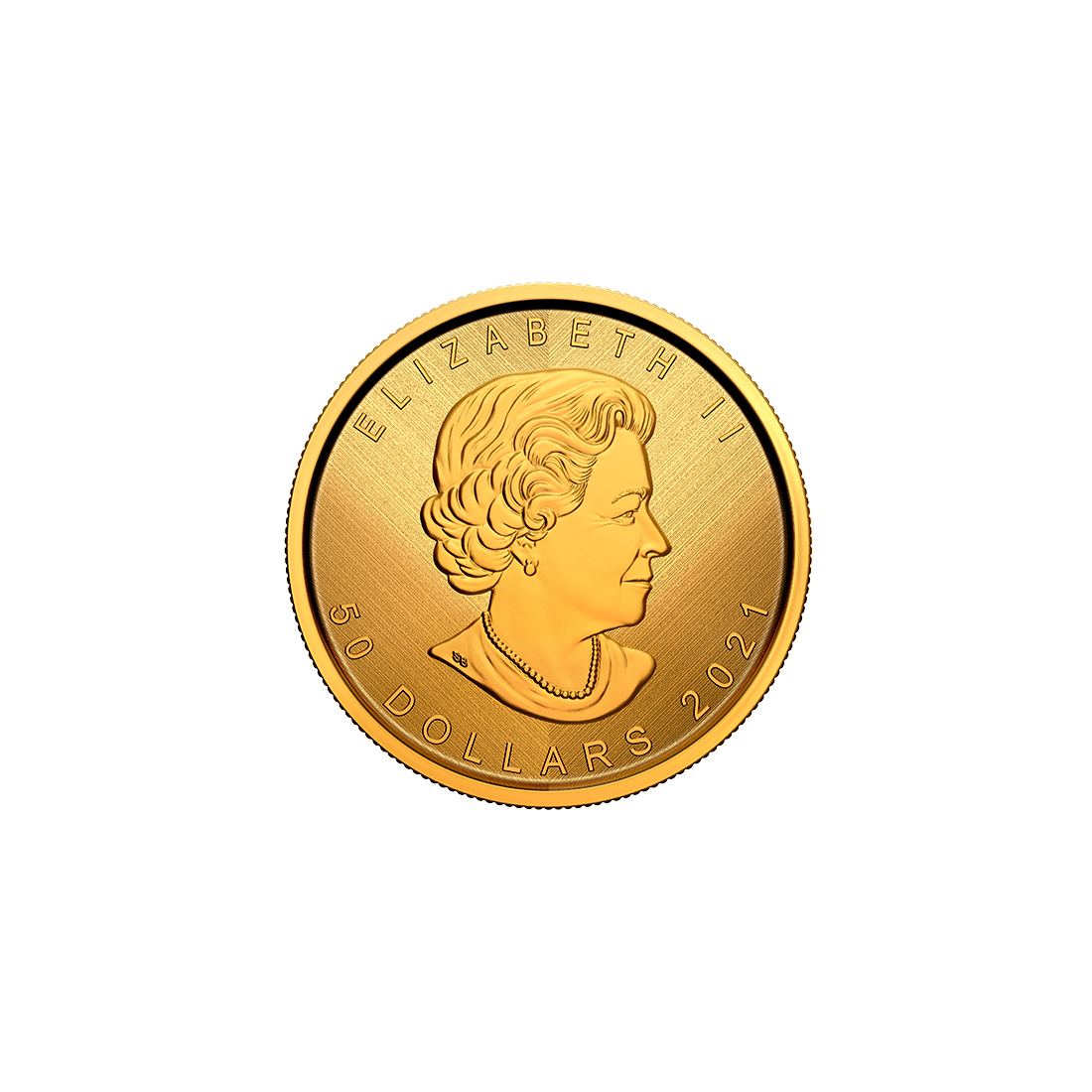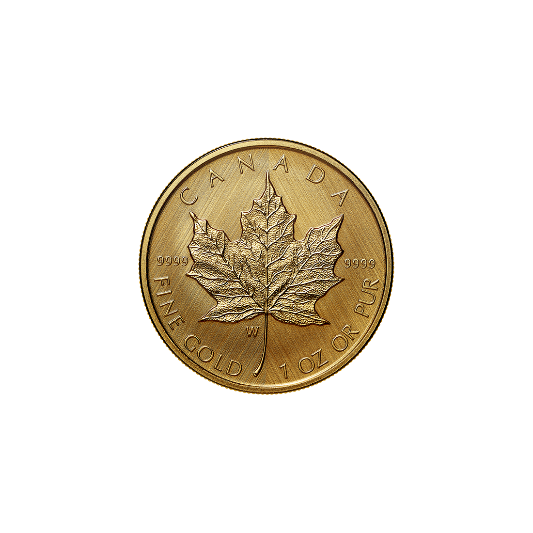 The reverse of the gold coin features a maple leaf, one of Canada's symbols. Next to it, the characteristic letter W – the mint mark – is struck. The reverse also includes information about the weight and quality of the gold and the issuing country.