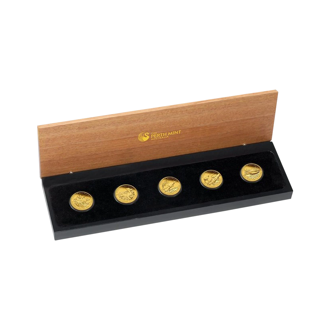 The set consists of five gold coins, housed in an elegant wooden collector's case with the series logo engraved and a magnetically closed lid. The interior of the case is lined with black velvet, in which the coins are precisely set. Each coin features on the reverse the image of one of the characteristic Australian animals: emu, platypus, kangaroo, Tasmanian devil, and whale. They are shown in their natural environment to further emphasize the uniqueness and diversity of the continent. Around the central motif, the species name, series name, as well as weight and year of issue markings are placed. The obverse of each coin is adorned with the classic portrait of Queen Elizabeth II, by Ian Rank-Broadley. It also includes the denomination, expressed in Australian dollars, and the country's name. All coins are struck with a proof finish, giving them contrast between the shiny background and the matte relief.