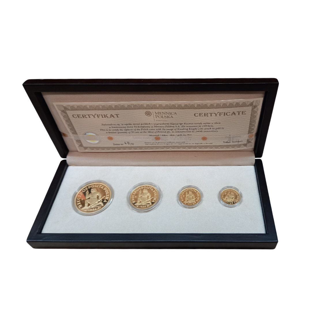 An exclusive set of replicas of Polish coins featuring the "Kneeling Knight" from 1924, minted in a limited edition of 50 sets by the Polish Mint. The coins are made of 900 gold, emphasizing their uniqueness and collectible value.