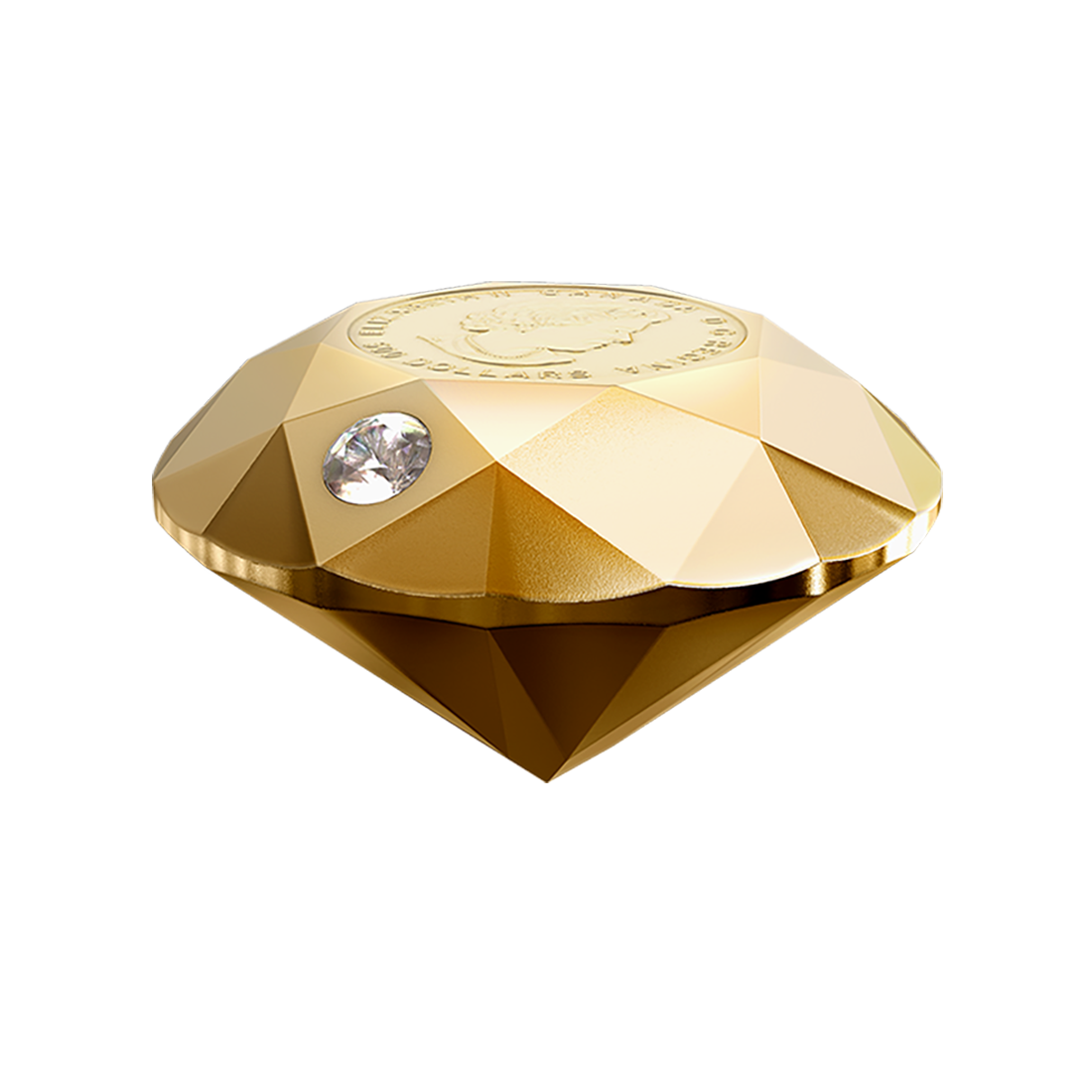 The coin attracts attention with its unique shape. Each facet is carefully crafted to shine like a real diamond.