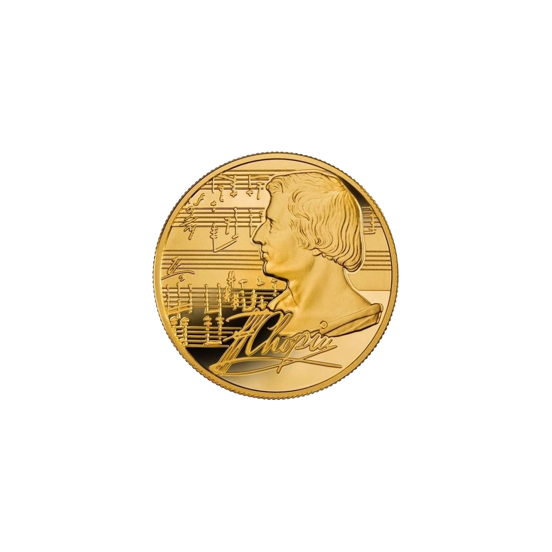 Exclusive gold bullion coin featuring Frédéric Chopin, struck in pure gold by the Polish Mint.