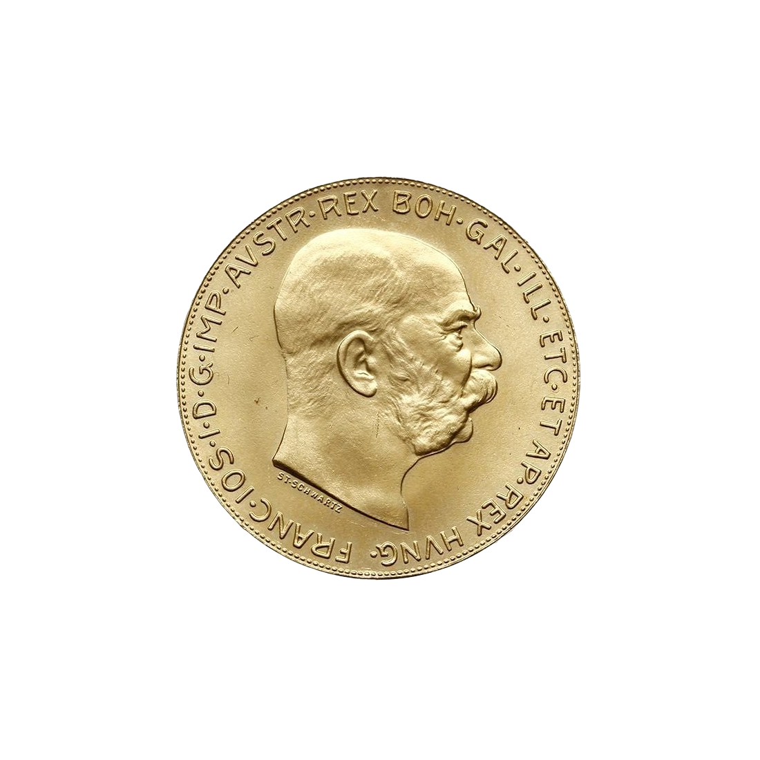 The 100 Corona gold coin was minted from material with a fineness of 900. Historically, the gold coin has been minted since 1892, when Franz Joseph I initiated a currency reform in Austria-Hungary. The gold coin with a denomination of 100 Corona was issued from 1908 in honor of the emperor's diamond jubilee.