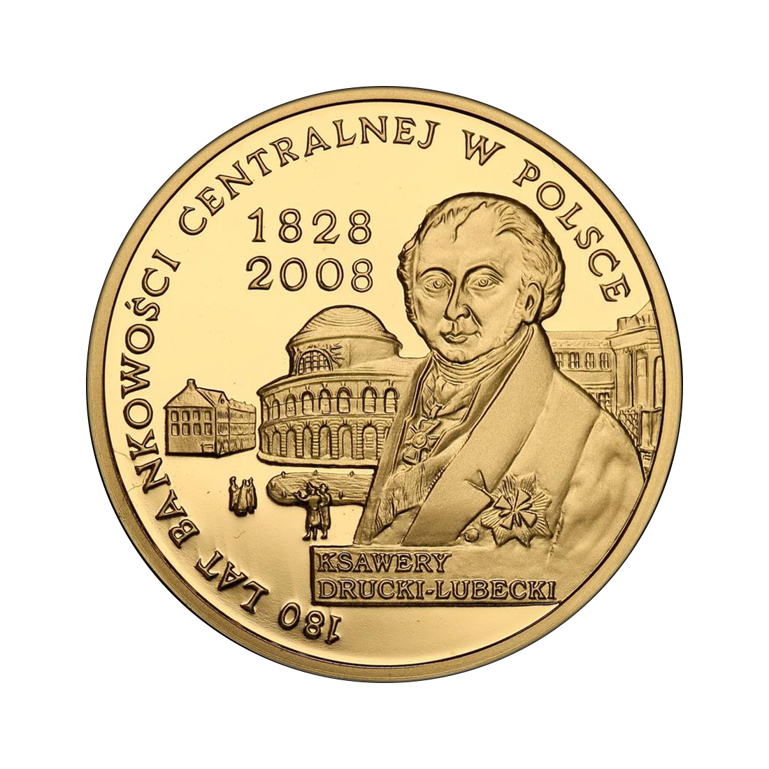The reverse of the coin is dominated by a stylized image of Ksawery Drucki Lubecki, a figure significant in Polish banking history. Below the image is the inscription "KSAWERY/DRUCKI-LUBECKI." In the background, there is a picturesque image of the headquarters of the Bank of Poland in Warsaw, located at Bank Square. At the top left is the inscription "1828/2008," referring to the founding date of the bank. The edge of the coin is adorned with the inscription "180 LAT BANKOWOŚCI CENTRALNEJ W POLSCE," highlighting not only the anniversary but also the significance of the Bank of Poland in shaping the country's economy.