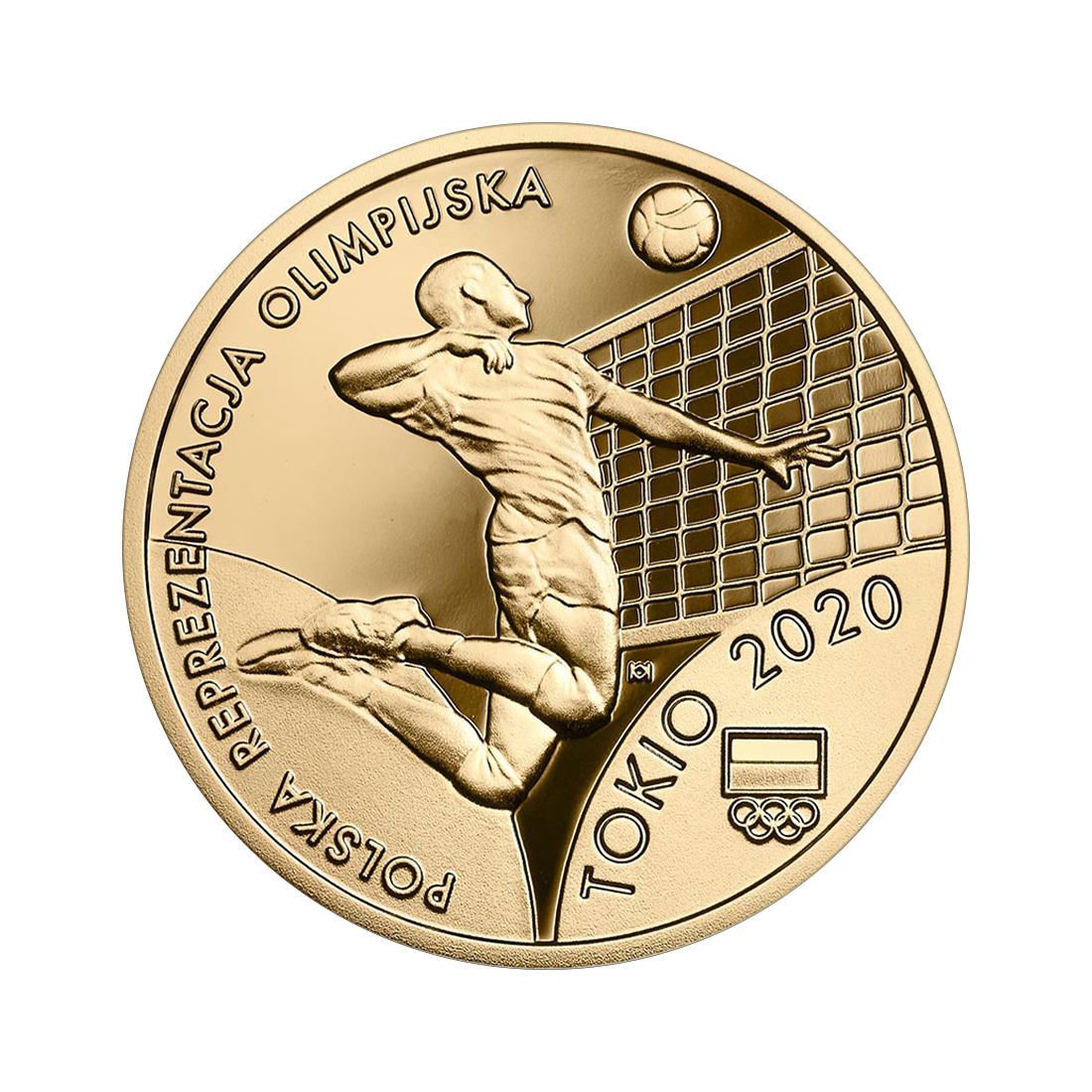 The coin has a modern, dynamic appearance, combining a sporty character with the elegance of a gold surface. The composition is expressive and symbolic, emphasizing the Olympic spirit. The reverse features the silhouette of a volleyball player in a dynamic attack, with an arm raised to strike the ball. The figure exudes energy and movement. On the left side, there is an inscription in a semicircle POLSKA REPREZENTACJA OLIMPIJSKA, accentuating the national dimension of the issue. On the right side, the inscription TOKYO 2020 is visible, with the emblem of the Polish Olympic Committee below, combining the white and red flag with the Olympic rings. The obverse shows a dynamic silhouette of a volleyball player in action, with the inscription TOKYO in the background. On the right side is an eagle with a crown – the emblem of Poland, and below it the year of issue and denomination. The coin combines modernity with an official character, reflecting the spirit of the Olympic Games.