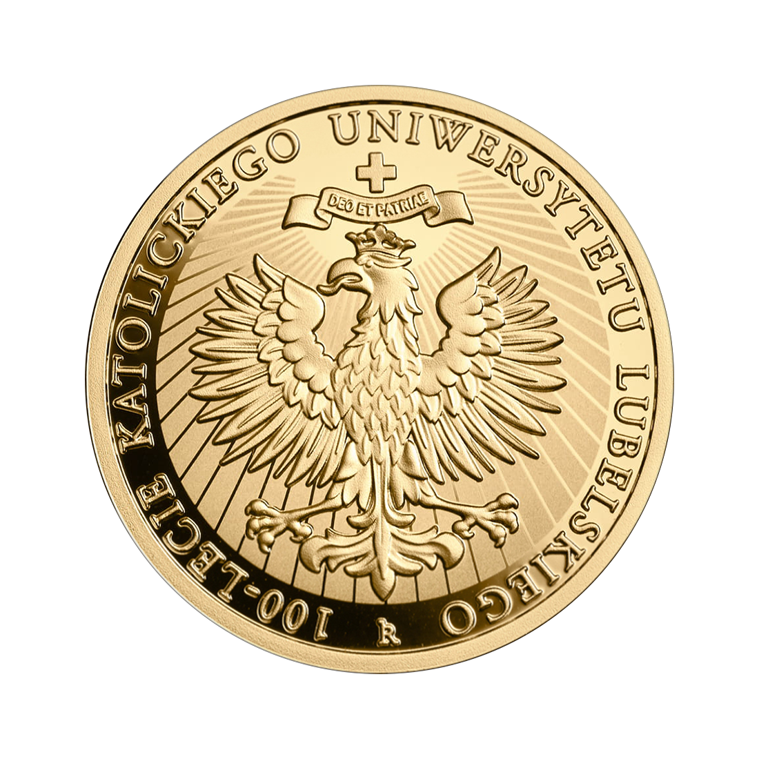 The numismatic piece was minted in gold in proof standard and features a refined design, emphasizing its prestigious character. On the obverse of the coin, in the central part, there is a rich composition symbolizing the university: a staff with a heart and a cross, referring to Christian traditions and values, next to which the university's motto Deo et Patriae ("For God and Country") is placed. On the left side, the abbreviation KUL is visible, and below it, the denomination. On the right side, the emblem of the Republic of Poland is found, inscribed in a form outlined by planes and architectural details such as the organs from the Cardinal Stefan Wyszyński Hall, where the most important ceremonies take place. On the reverse of the gold coin, the KUL coat of arms is placed, which is a large, expansive image of the White Eagle in heraldic form, with a crown on its head. Above, against the background of a radiant burst, a ribbon with the university's motto and a cross is placed. The inscription: 100TH ANNIVERSARY OF THE CATHOLIC UNIVERSITY OF LUBLIN, encircles the composition in an elegant, classic form.