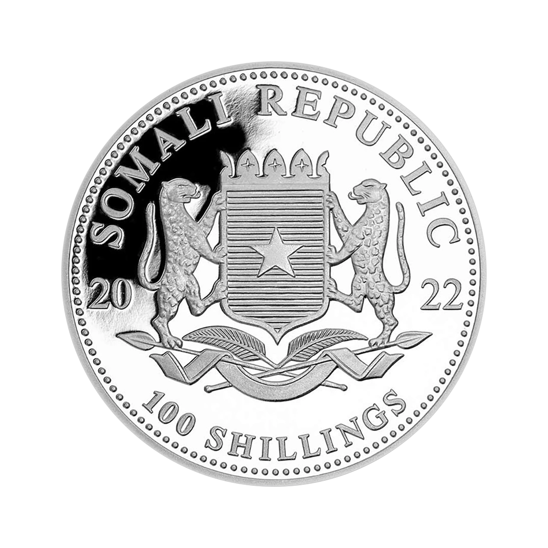 The obverse presents the coat of arms of Somalia, featuring two leopards holding a shield with a white star. Additionally, the obverse includes information about the year of issue and the nominal value of the coin.