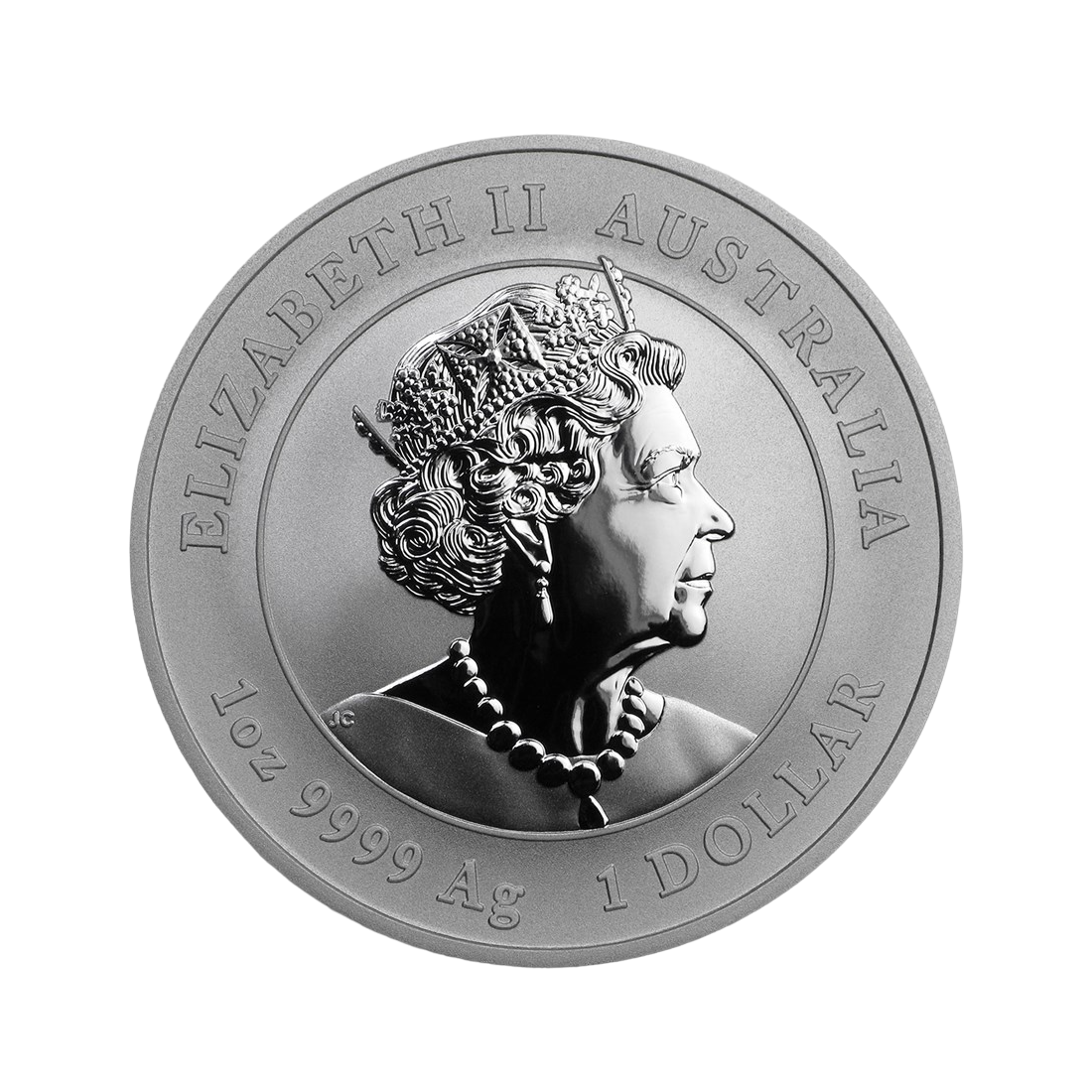 The obverse presents the bust of Elizabeth II. It also includes information such as the issuing country (Australia), the nominal value of the coin (1 DOLLAR), weight (1 oz), and the purity of the metal (9999).