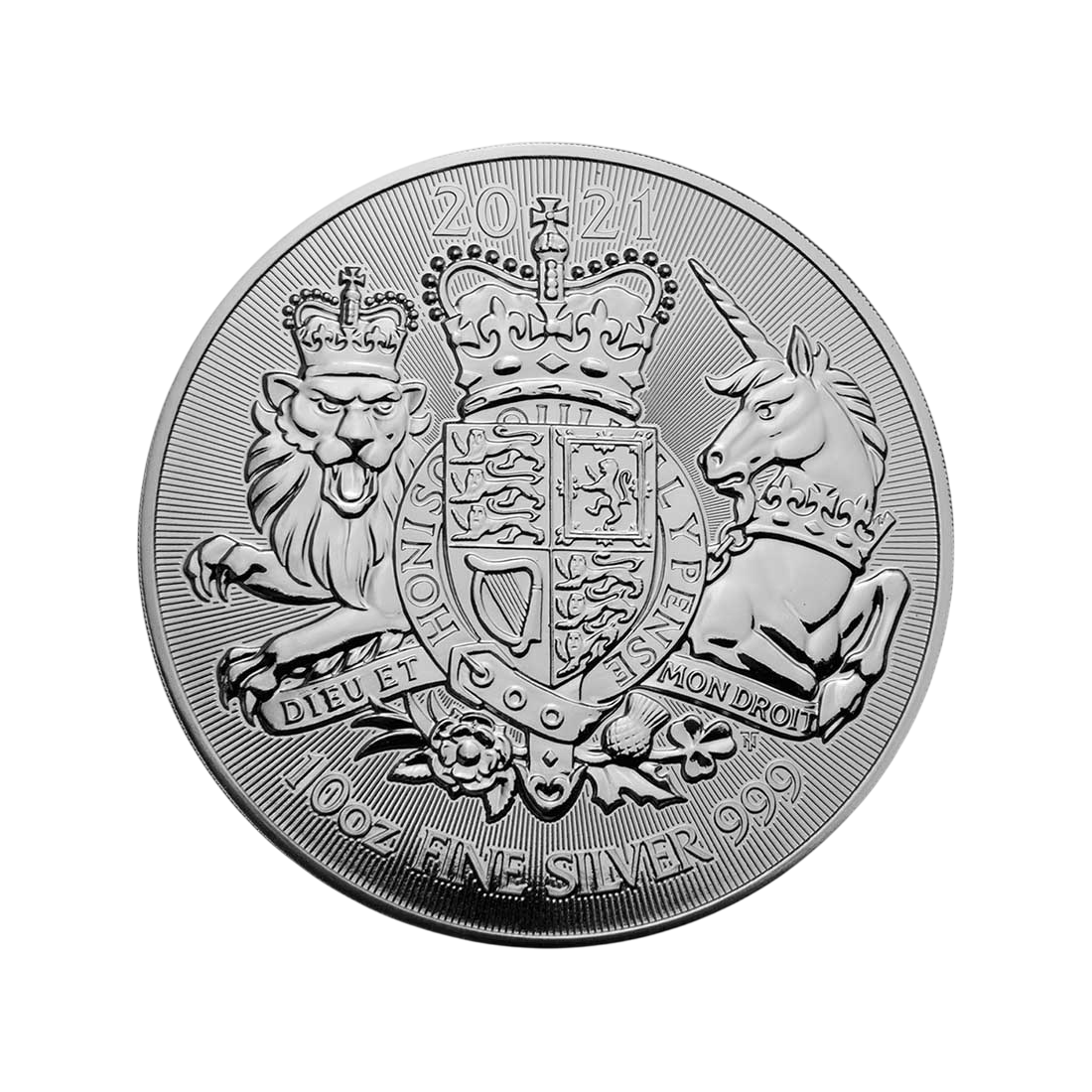 This silver bullion coin from the Royal Mint features the royal arms – The Royal Arms, a symbol of the strength and majesty of Great Britain. This coin contains 1 ounce of silver with a purity of 999, and the obverse features the image of the ruler of the United Kingdom along with the denomination of 2 pounds.