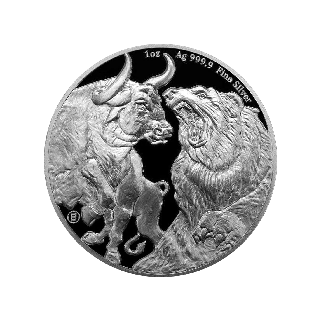 On the reverse of the coin, we can admire the clear silhouettes of the bull and bear in an epic battle. Above these powerful symbols, information about the weight and purity of the silver is placed, reminding us that we are dealing with an exceptional precious metal. The inscription "1 oz Ag 999.9 Fine Silver" guarantees the highest quality silver. Below the animal silhouettes, there is a subtle mint mark, which attests to the authenticity and quality of this coin.