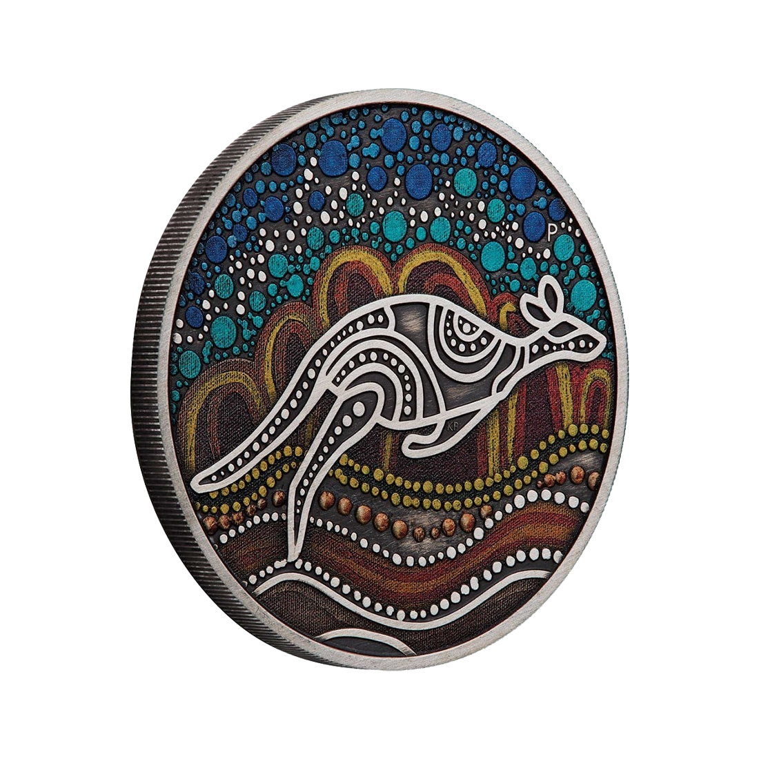 The reverse of the coin depicts a kangaroo (yongka) running through green grass and ochre boodja rocks, against the backdrop of the earthy colors of the indigenous lands of Australia. Above its head is the evening sky, represented by turquoise, blue, and black dots symbolizing stars.