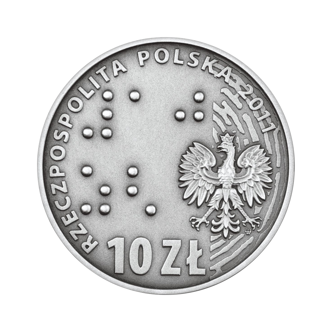 The reverse of the coin features an image of a maze, with two figures, one of whom is holding a blind person's cane. The inscription EUROPE WITHOUT BARRIERS is present, along with stars symbolizing the old continent. The obverse shows a fragment of the maze and the nominal value written in Braille. There is also the inscription RZECZPOSPOLITA POLSKA 2011 and the national emblem.