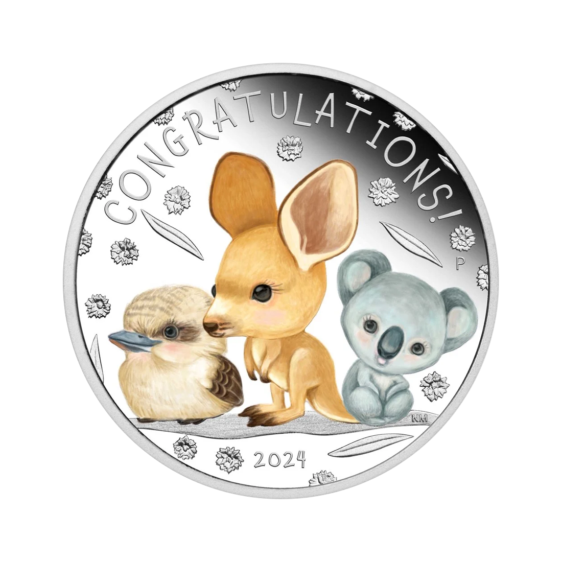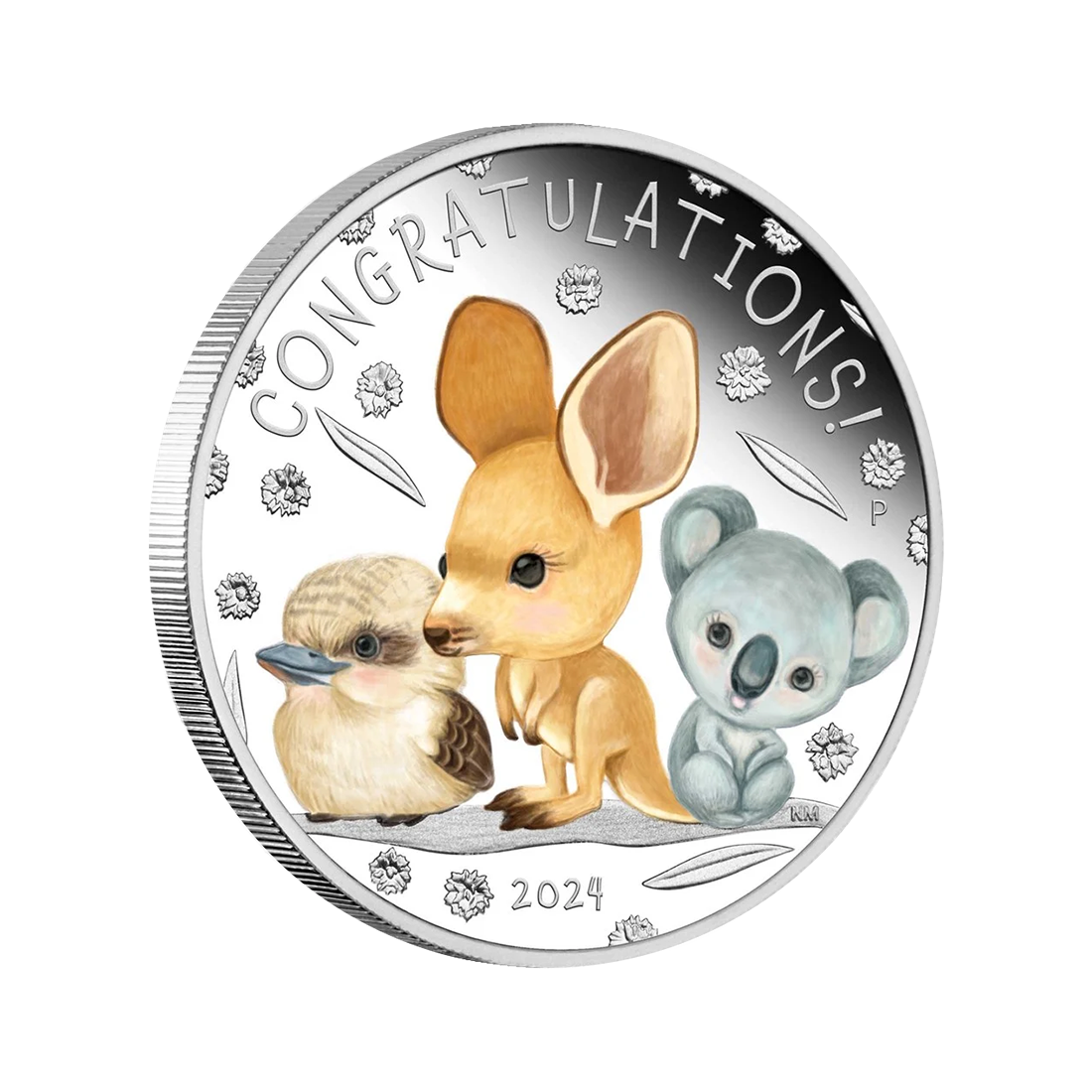 The coin with colorful illustrations depicts a young bird called a kookaburra, a kangaroo, and a koala. The design also includes eucalyptus leaves and spiky shoots, as well as the inscription CONGRATULATIONS! in English and the mintmark of the Perth Mint.