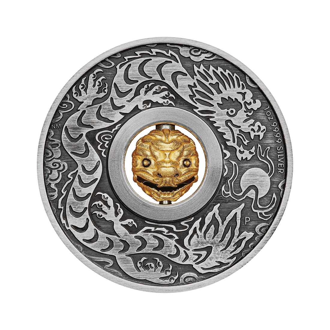 In the center of the coin's reverse is a rotating charm in the form of a dragon's head. It is made of 925 silver covered with 18-carat gold. Around it, the entire figure of the dragon and a symbolic flaming pearl are engraved. The coin is also adorned with the Perth Mint's mark - the letter P, and the whole has been "antiqued" to give it a unique finish reflecting the traces of an ancient artifact.