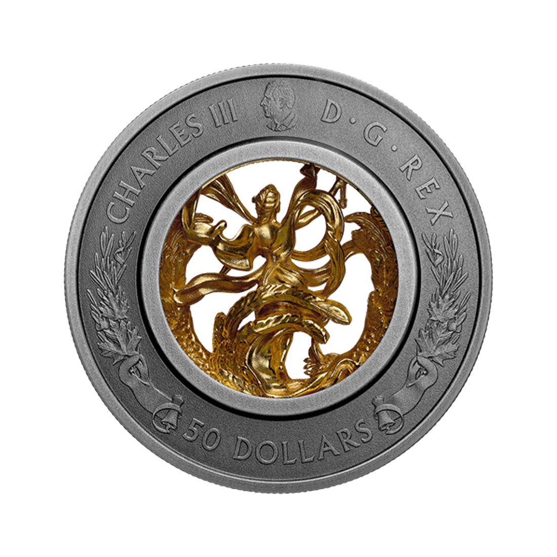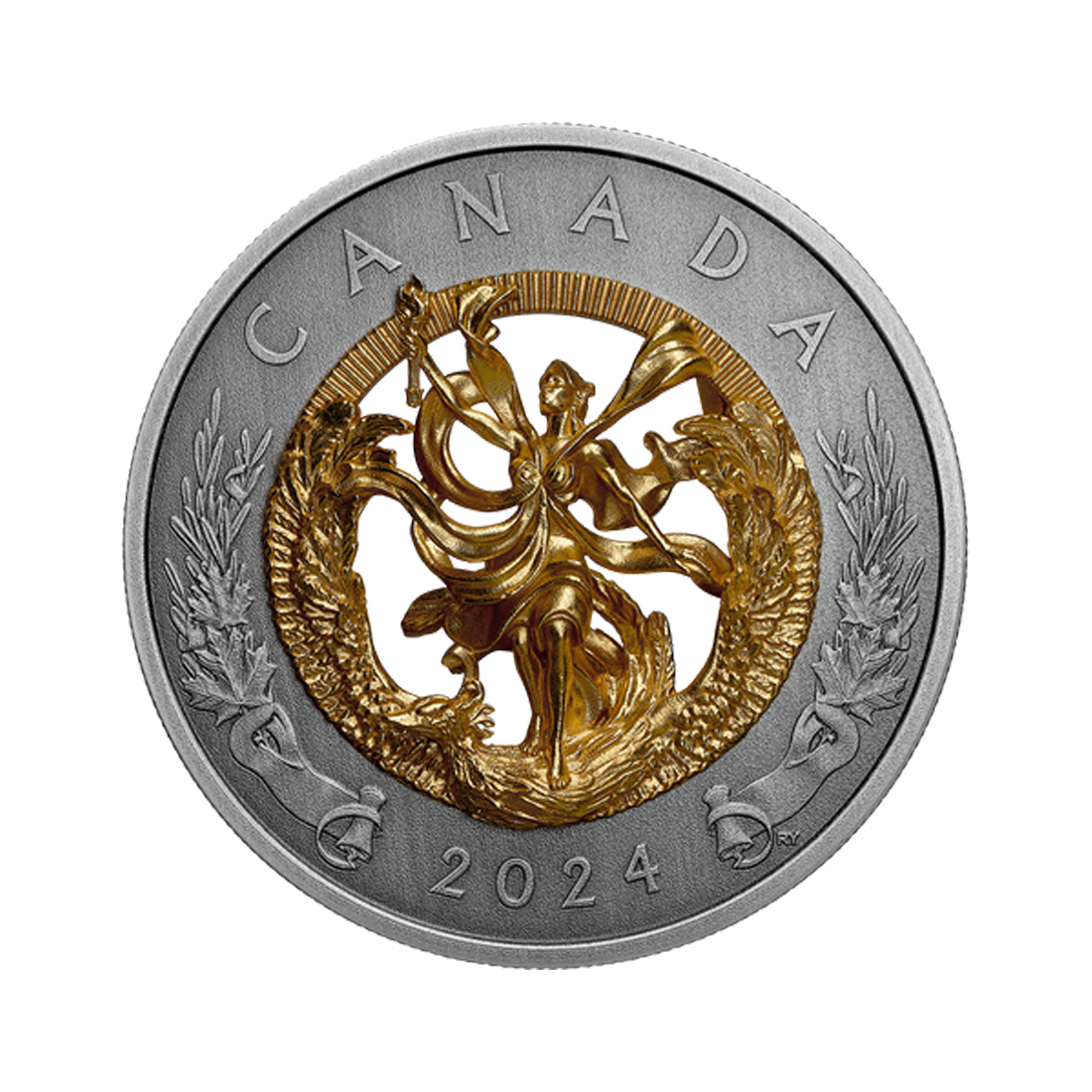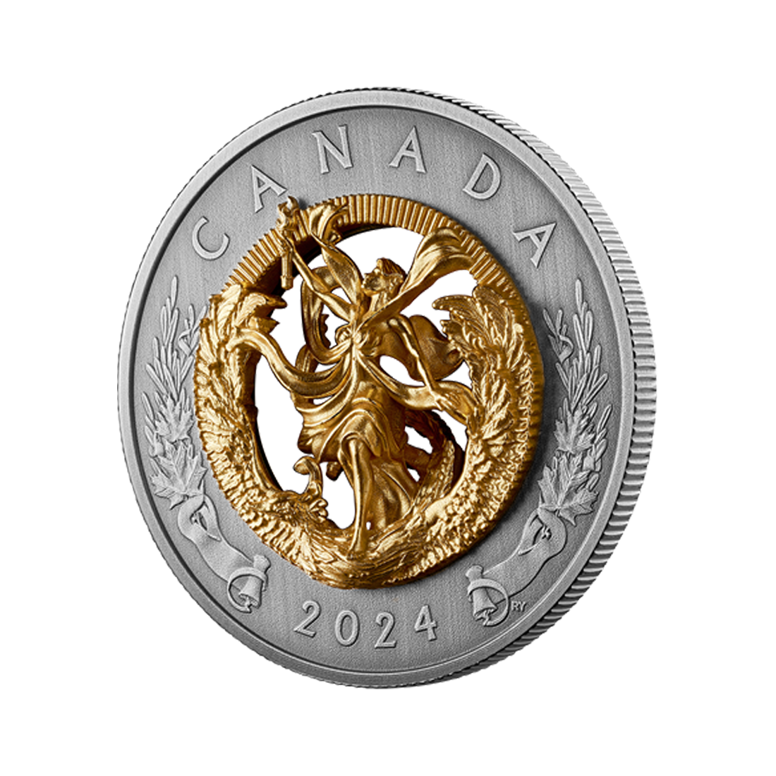 The silver coin features a double-sided 3D figurine at its center, cast entirely from 99.99% pure silver. It depicts the figure of Freedom, a woman seated on a mythical bird, shown in flight. In her hand, she holds a torch, illuminating the path. Visible on both the obverse and reverse of the coin, it is gold-plated and symbolizes hope, guidance, and optimism. The obverse features the effigy of King Charles III by Steven Rosati. Additionally, the coin is adorned on both sides, along the outer edge, with scrolls, olive branches, and maple leaves, symbolizing Canada's contribution to global peace and freedom. The coin design is by Rebeka Yanovskaya.