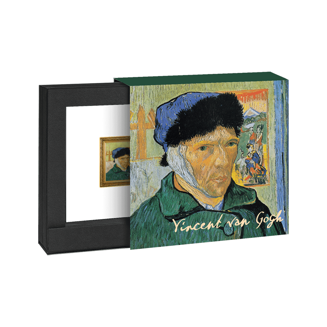 A meticulously crafted item that pays homage to one of the most famous and emotional works in art history. The design faithfully reproduces the iconic image, emphasizing its depth. The "Van Gogh Self-Portrait with Bandaged Ear" is featured on the obverse of the coin. It depicts Van Gogh in a green coat and fur-lined hat. His right ear is covered with a bandage. The design captured the somber expression of the artist, reflecting the emotional turmoil he experienced during this period of his life. Details of the image, such as the texture of his coat and bandage, have been carefully recreated to reflect the depth of the original artwork. The background includes elements from the original painting, such as the wall of Van Gogh's room and an easel.