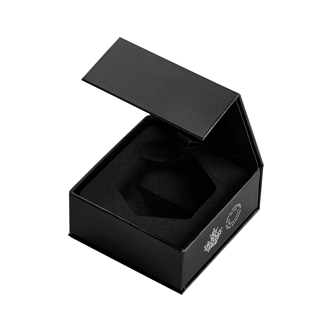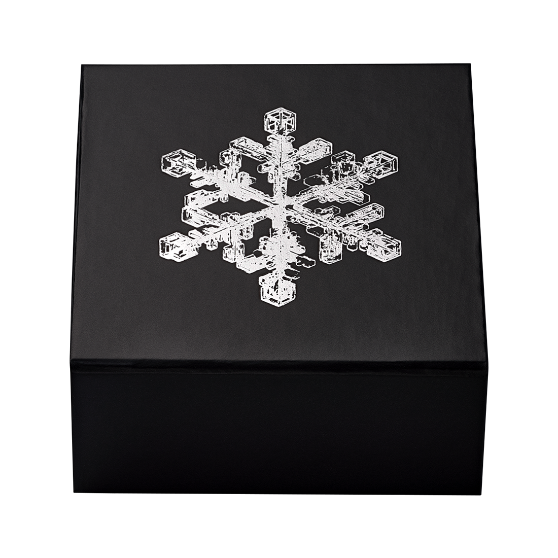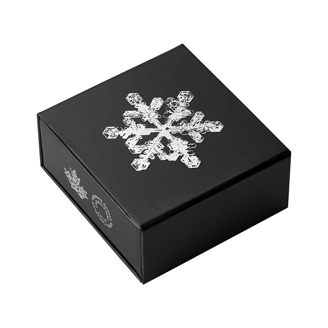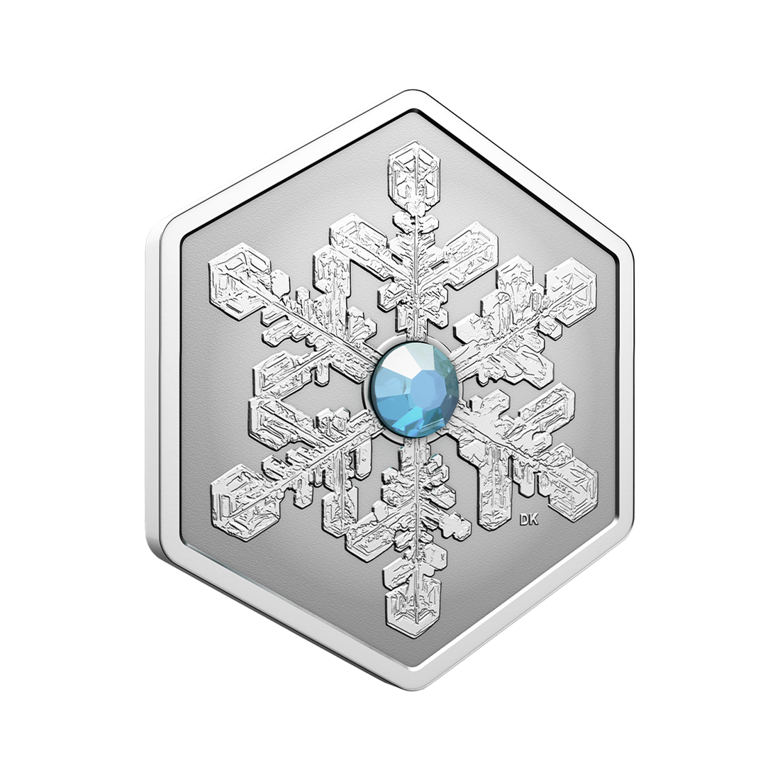 A hexagonal coin made of pure silver, depicting a crystal snowflake. It is an intricately engraved design, inspired by the classic crystal of star-shaped snow dendrites. In the center of the coin is a light blue crystal, reminiscent of the glow of freshly fallen snow. The coin weighs 1 ounce, with a mintage of 7,500 pieces, and is delivered in a display box, along with a certificate of authenticity. It is the second coin in the Snowflake series.