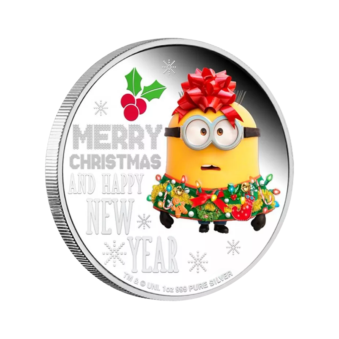The reverse of the coin depicts a colorful image of a funny Minion wearing various Christmas decorations. On the left side of the reverse, there is an inscription: MERRY CHRISTMAS & HAPPY NEW YEAR.