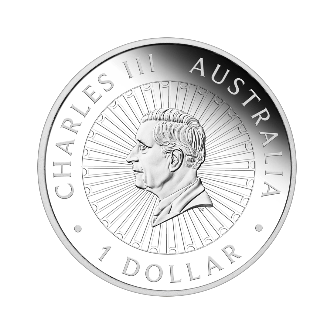 The specimen impresses with its elegant and detailed design. Made of shiny silver, it has a proof finish that gives it an impressive contrast between glossy and matte elements. The reverse features the outline of the Australian continent, filled with natural chrysoprase of an intensely green color, giving the coin a unique character. The background of the reverse is adorned with intricately engraved patterns inspired by Australian flora and fauna, further emphasizing its regional character. The obverse presents a classic image of King Charles III, surrounded by inscriptions informing about the denomination, year of issue, and country of origin. The coin stands out with a modern and exclusive style, perfectly combining the beauty of nature with minting craftsmanship.