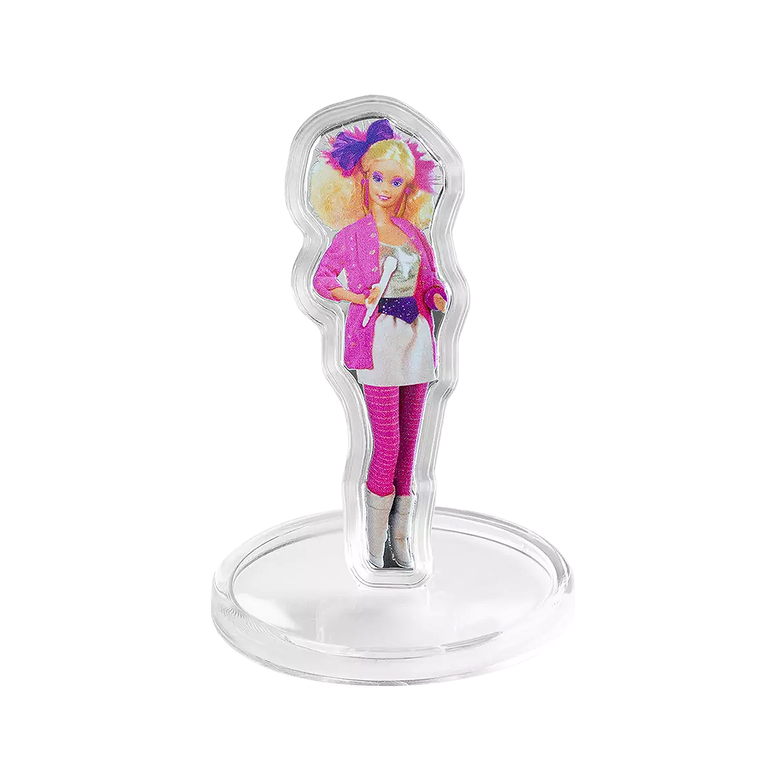 An extraordinary collectible coin, minted from one ounce of pure silver, inspired by the popular Barbie doll. It captivates with its unique design. This coin references the style of the 80s and the iconic line of dolls, specifically "Barbie and the Rockers," which was a style and music icon of that era. It is an excellent choice for both Barbie enthusiasts and collectors who appreciate unique, themed coin editions. The product is packaged in an elegant collector's box and makes a great gift or investment idea.
