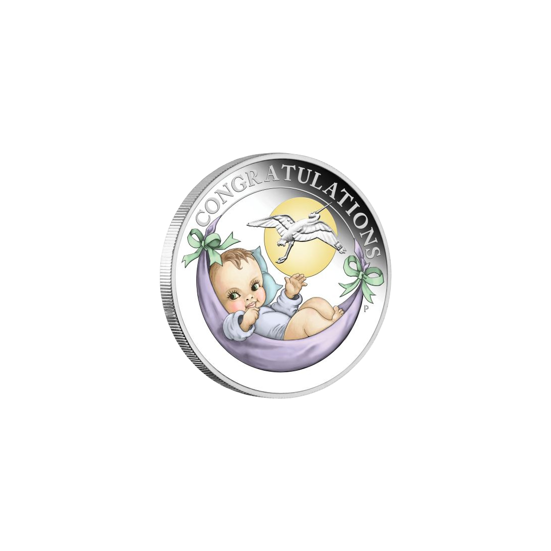 The reverse of the coin features an image of a baby depicted against the backdrop of a moonlit night. The stork appearing on the product is, according to many cultures and beliefs, a symbol of purity and fertility. The whole is punctuated with the English inscription – CONGRATULATIONS.