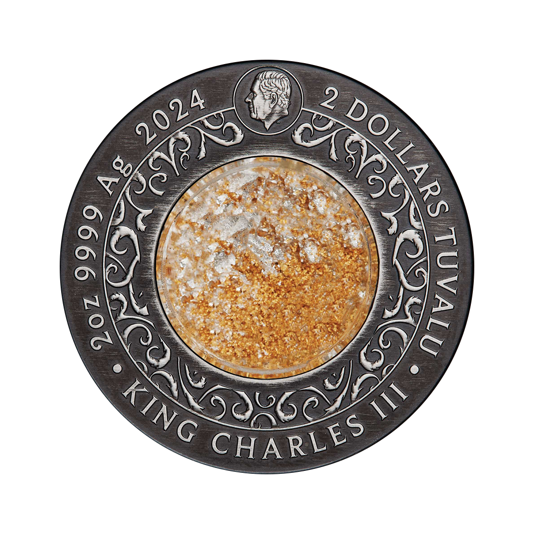 The coin's design focuses on showcasing the mystical beauty of the Alicanto, combining it with the mysterious image of the desert. The bird, illuminated by the moonlight, is on the reverse of the coin, and its body, shimmering with luminescent colors, symbolizes the mythical "luminous" nature of the bird. It surrounds a dome located in the center, containing authentic particles of gold and silver suspended in a transparent liquid, creating a captivating spectacle of shimmering beauty. In the background are elements of the desert landscape, emphasizing the mystery and harshness of the place where the Alicanto is said to appear. The antique finish of the surface adds a unique character to the coin, giving it the appearance of an ancient artifact. The obverse of the coin also features a metallic dome, surrounded by information about the denomination, purity, year, and country of issue. There is also a portrait of His Majesty King Charles III.