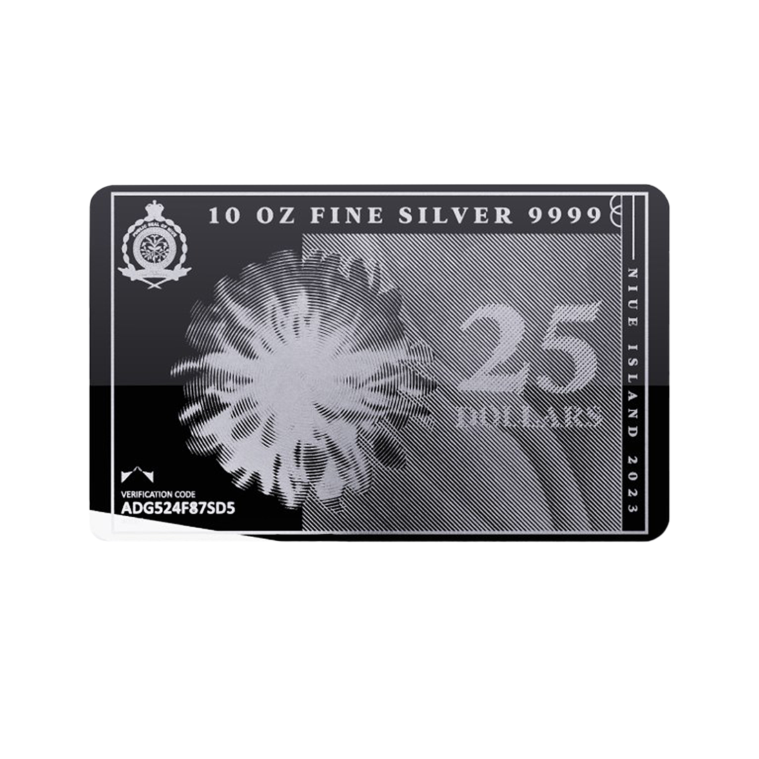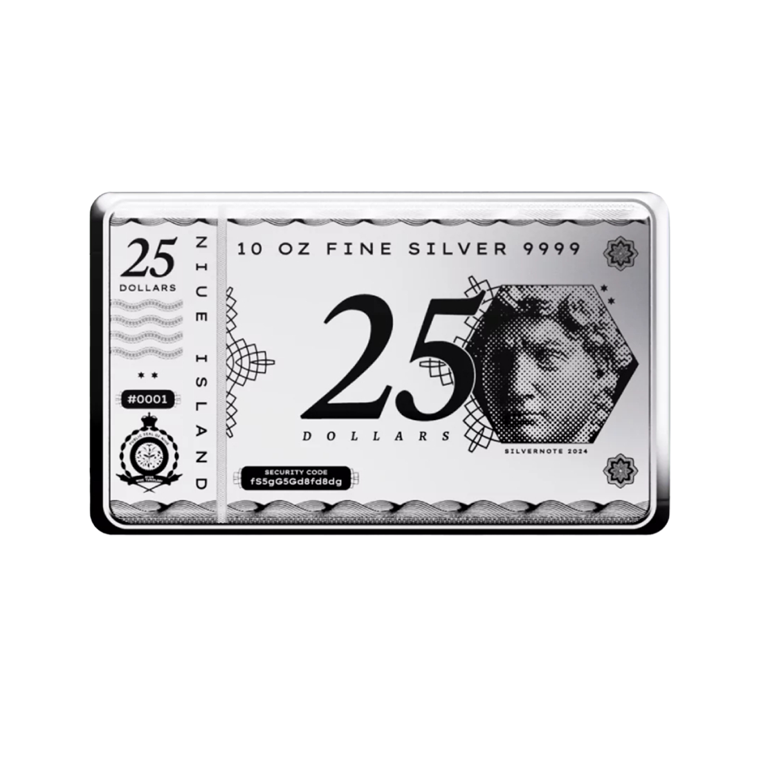 The specimen has an extremely distinctive appearance, combining the features of a bar and a banknote. It has a rectangular shape with slightly rounded corners, reminiscent of a traditional banknote. The entire surface of the bar is smooth and uniform, highlighting the shine of the silver. On one side, there is a detailed graphic resembling the appearance of a banknote, with elements reminiscent of currency symbols. On the other side, the official emblem of Niue is displayed, along with an inscription informing about the country of issue and the nominal value of the coin, which are carefully integrated into a minimalist yet elegant design. The bar is lightweight and handy, combining aesthetic qualities with practicality.