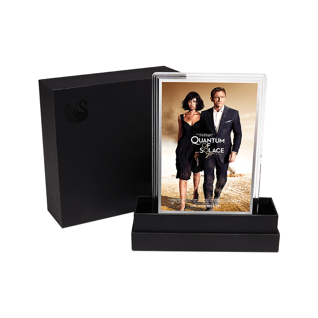 The James Bond movie poster from the film "Quantum of Solace" from 2020 is a unique keepsake for fans of the iconic series. Made on a 5-gram silver foil, it represents an excellent combination of modern technology with classic design. Every detail of the poster is carefully reproduced, making it an exceptional collector's item. The image features familiar motifs from the film, led by the character of James Bond, in a characteristic setting full of action and tension. This edition combines the elegance of metal with the aesthetics of action cinema, offering high-quality graphics that catch the eye and serve as a perfect decoration for any interior.