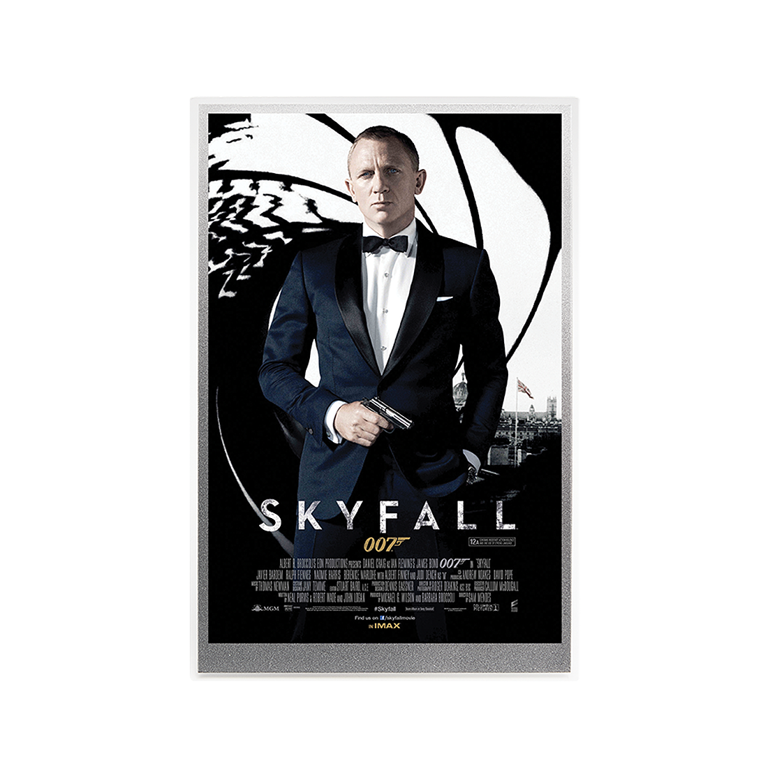 The official poster from the 2020 film "James Bond: Skyfall," presented in color on silver foil. This is a unique product that perfectly captures the atmosphere of the iconic production, combining film art with precise minting technology. The poster features the globally recognizable James Bond, portrayed by Daniel Craig, along with production information and elements typical of the 007 film series. It is an excellent choice for collectors and fans of the series who wish to commemorate one of the best films in cinema history. Thanks to the unique material, the poster gains a subtle yet very expressive aesthetic, fitting perfectly into modern interiors and serving as a true decoration for any space.