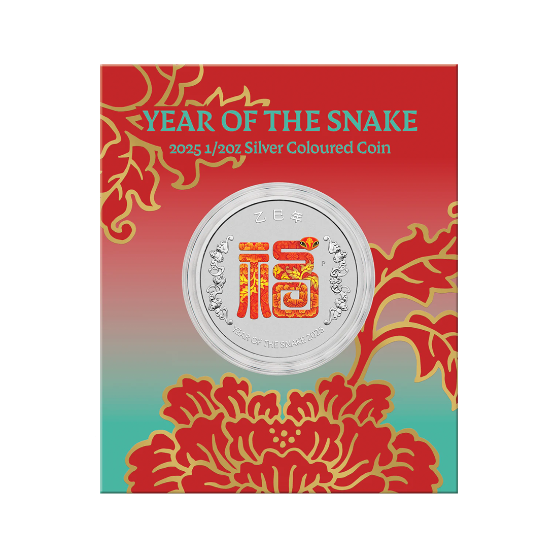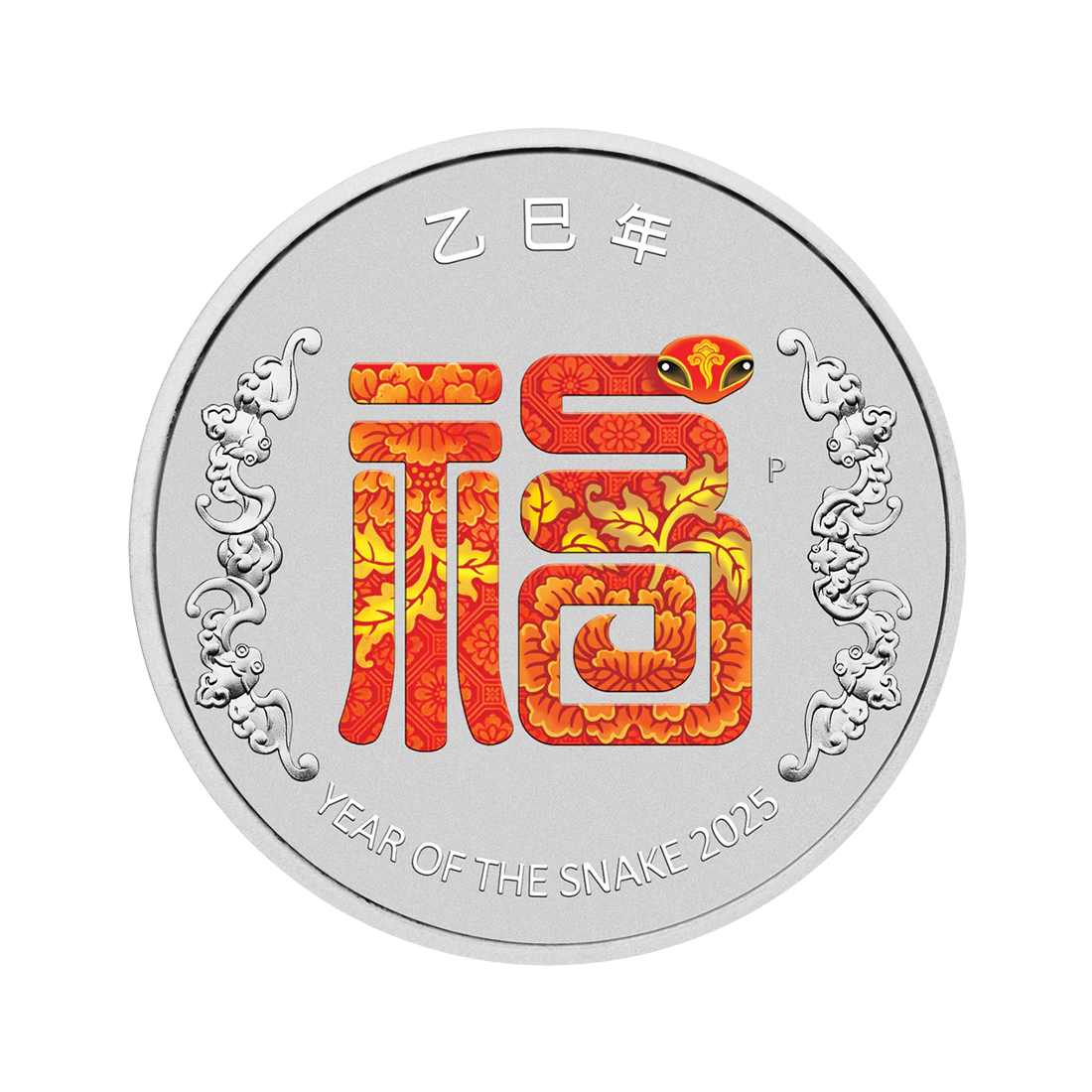 The symbolism of the coin refers to the Chinese zodiac sign of the Snake, which is the sixth animal in the twelve-year cycle and has long been associated with wisdom, intuition, and the ability to transform. The 福 (Fu) symbol adorning the reverse of the coin has a centuries-old significance in Chinese culture as a symbol of luck, prosperity, and well-being. It is often used in art, calligraphy, and New Year decorations, especially during the Chinese New Year period.