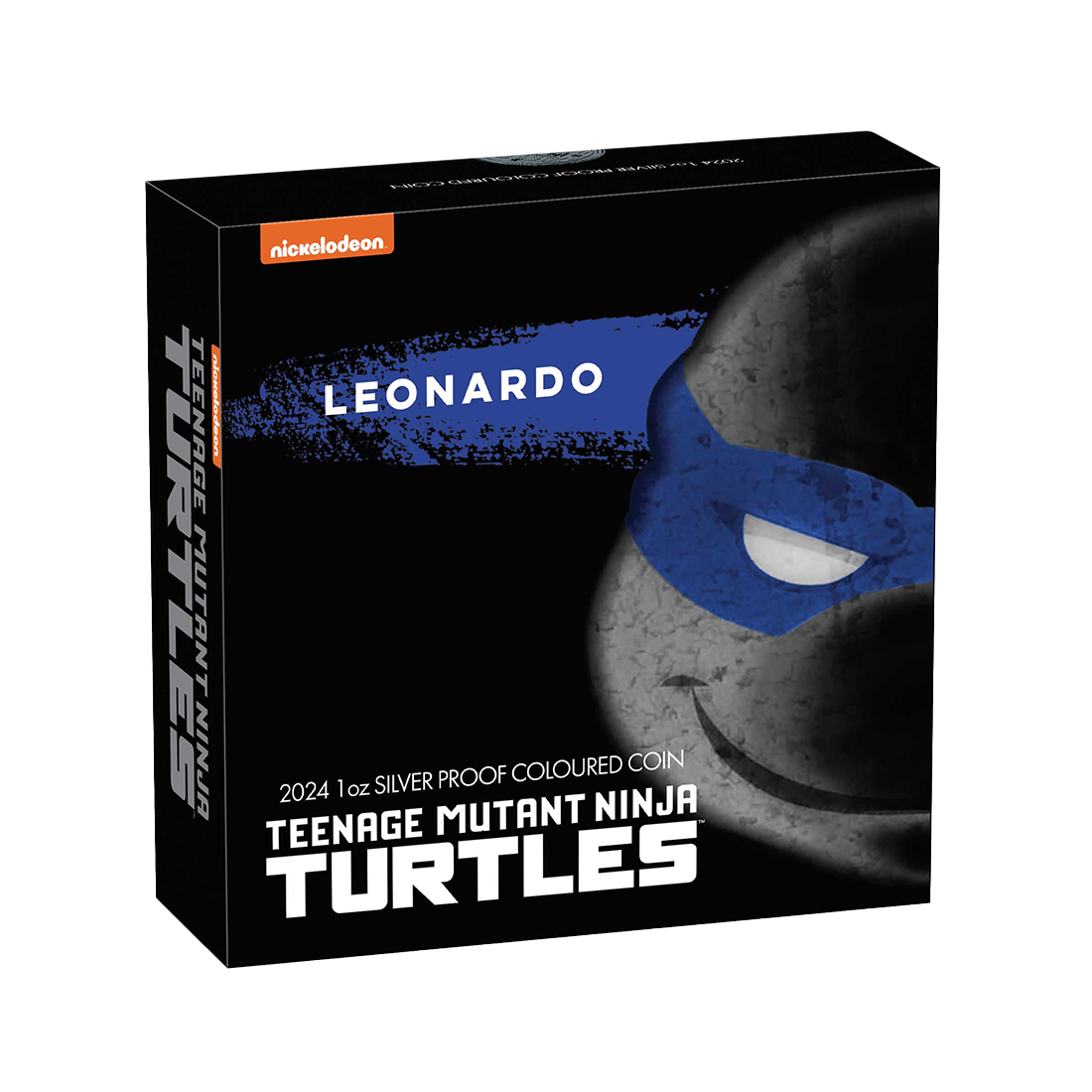 The coin features a colorized image of Leonardo, one of the Teenage Mutant Ninja Turtles. He is depicted in a battle pose on the reverse, with his characteristic katana swords in hand. He is surrounded by a detailed urban background, reminiscent of the comic and animated style of the series. His name is also in the background. The obverse of the coin is adorned with the official portrait of His Majesty King Charles III, by Jody Clark, along with the issuer's name, year of issue, weight, silver fineness, and denomination. The coin is characterized by high-quality proof finish, which means a mirror-like background surface and matte details, highlighting the precision of craftsmanship.