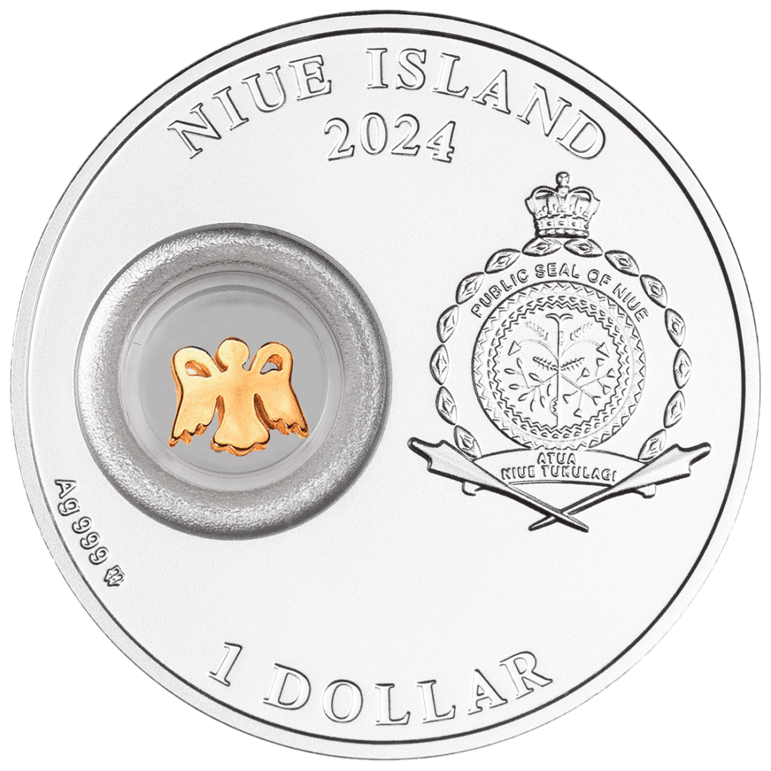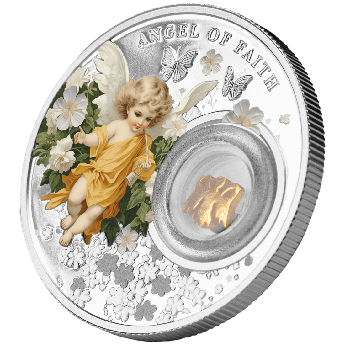 The Silver Angel of Faith Coin stands out not only for its high silver purity but also for its unique design. The central element of the reverse is the image of an angel, symbolizing protective power and spiritual support. The angel figure is intricately decorated with a filigree element covered in 24-carat gold, giving the coin exceptional brilliance and prestige. Additionally, the use of digital printing with photographic quality and microprinting highlights precision and attention to detail.